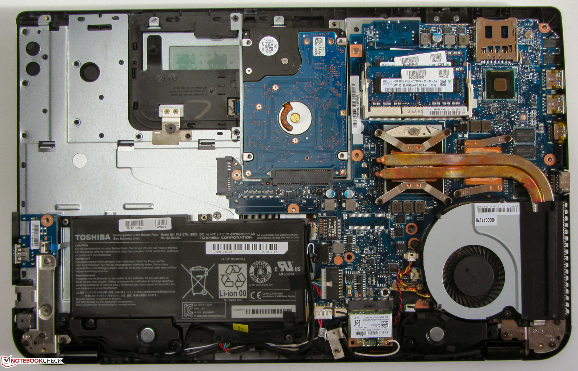 Der Lüfter des Notebooks kann zwecks Reinigung ausgebaut werden. Wer Ahnung von der Materie hat, könnte auch den Prozessor austauschen. Zwei Arbeitsspeicherbänke hat Toshiba dem Satellite spendiert; beide sind mit jeweils einem Vier-Gigabyte-Modul belegt. Somit arbeitet der Arbeitsspeicher im Dual-Channel-Modus. Ein Tausch der Festplatte wäre kein Problem. Toshiba verbaut in unserem Testgerät eine herkömmliche 2,5-Zoll-Festplatte mit einer Bauhöhe von 9,5 mm. Es passen aber auch dünnere Festplatten (Bauhöhe 7 mm) in das Gerät. Ein Akkuwechsel wäre machbar. Er wird von vier Schrauben gehalten und ist per Stecker mit der Hauptplatine verbunden.