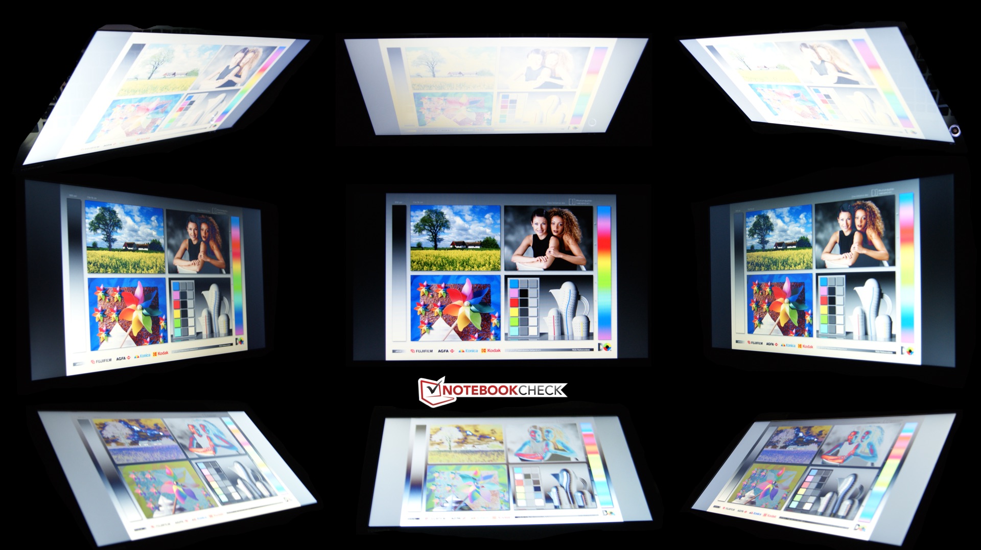 Toshiba verwendet ein günstiges TN-Panel, welches die Blickwinkelstabilität auf ein Minimum einschränkt. Farben und Helligkeiten werden bei Kippbewegungen und seitlicher Betrachtung immens verfälscht. Der maximale Öffnungswinkel des Displays von ca. 140 ° lässt allerdings auch einen Einsatz auf den Oberschenkeln zu.