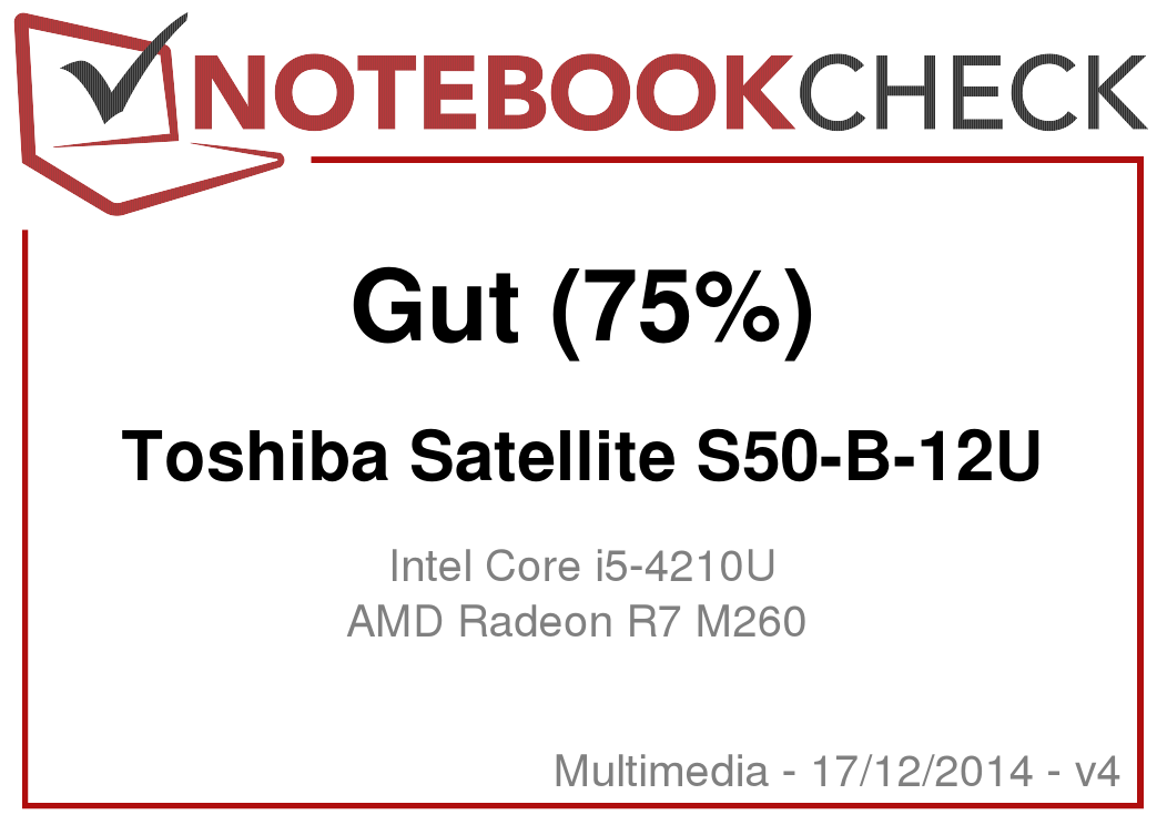 Das Toshiba Satellite S50-B-12U empfiehlt sich auf Grund seiner Komponenten für die Multimediakatgorie. Im ersten Teil des Tests konnten wir feststellen, dass es Defizite im Bereich der Scharniere und der Tastatur gibt. Der Bildschirmrand spiegelt wie das Display selbst stark im Außeneinsatz. Gefallen fanden wir allerdings an dem dünnen edlen Design. Mit 2 Kg ist es für die Notebookgröße besonders leicht zu transportieren. Die Rechen- und Grafikleistung konnte ebenfalls durchweg überzeugen. Bei der Lüftercharakteristik punktet das Toshiba besonders solange keine allzuhohe Last anliegt. Nicht die Lautstärke ist dann das große Problem, sondern die Hitzeentwicklung. Diese schränkt den Einsatz auf dem Schreibtisch nicht sonderlich ein, da die jeweiligen Hotspots nur an der Unterseite erreicht werden. Bessere Ergebnisse haben wir bei dem Acer Aspire E5-571G-536E gesehen. Solides Abschneiden wiederum erzielte das Satellite bei der Akkulaufzeit, auch wenn das Aspire wieder überlegen war.