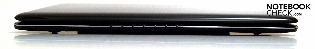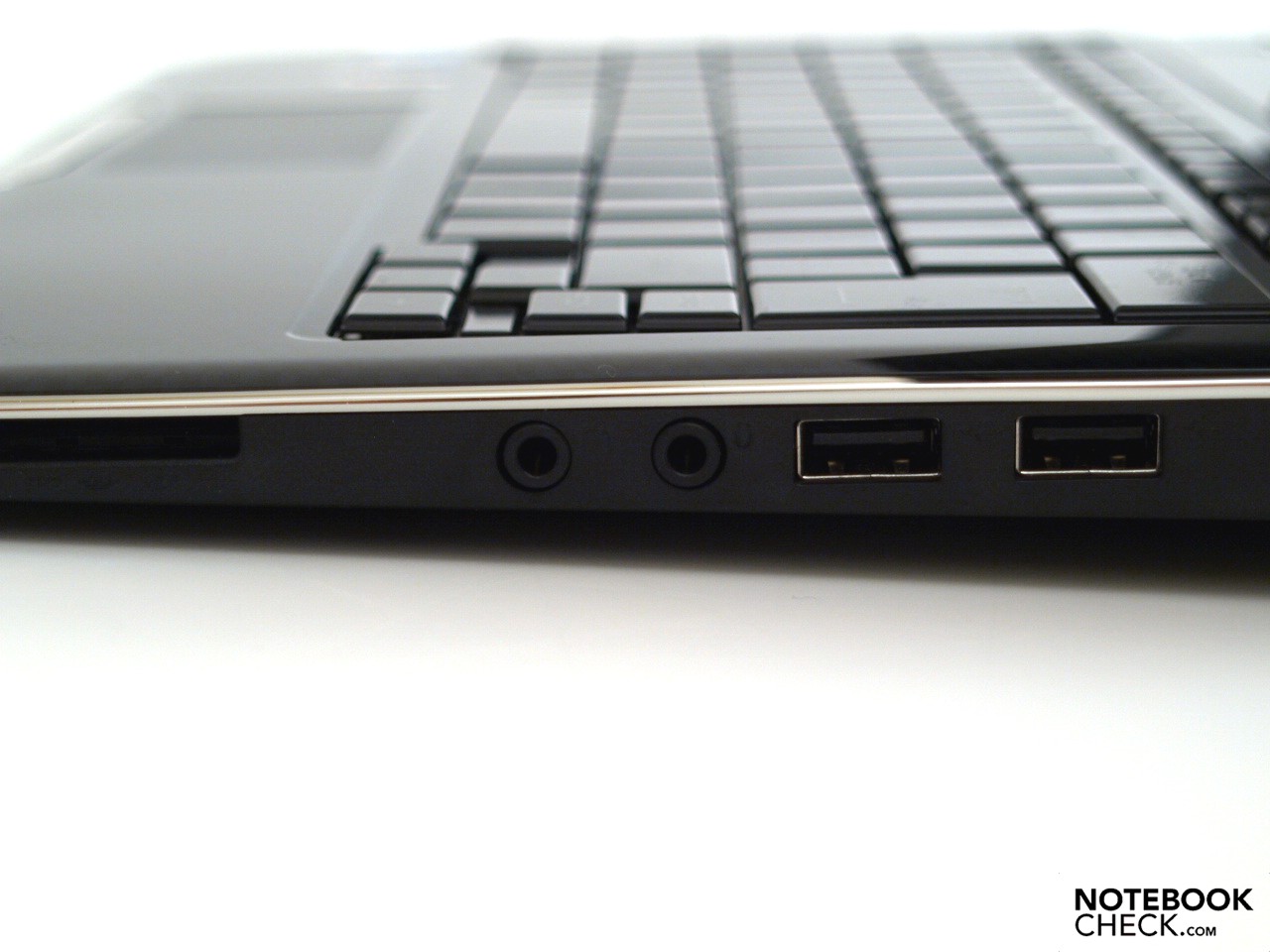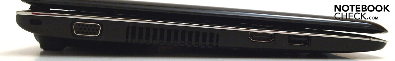 Zwar befinden sich die beiden oftmals permanent belegten Schnittstellen, LAN und VGA, in den hinteren Bereichen der beiden Seitenkanten, doch Linkshänder haben eventuell mit einer Einschränkung ihres Arbeitsbereiches durch Anschluss eines HDMI Kabels bzw. die Nutzung des im vorderen Bereiches der linken Seitenkante befindlichen USB-Anschlusses zu kämpfen. Dafür beherrscht dieser USB-Port den sogenannten Schlaf- und Lademodus, mit welchem USB Geräte wie digitale Audioplayer durch Anschluss an die USB Schnittstelle auch bei abgeschaltetem Laptop geladen werden können. Diese Funktion muss allerdings im BIOS aktiviert werden, ein entsprechendes Tool bietet dafür auch unter Windows 7 Unterstützung. Auf der rechten Seite befinden sich die beiden weiteren der insgesamt 3 USB-Schnittstellen und die beiden Audio-Ports im mittleren Bereich.