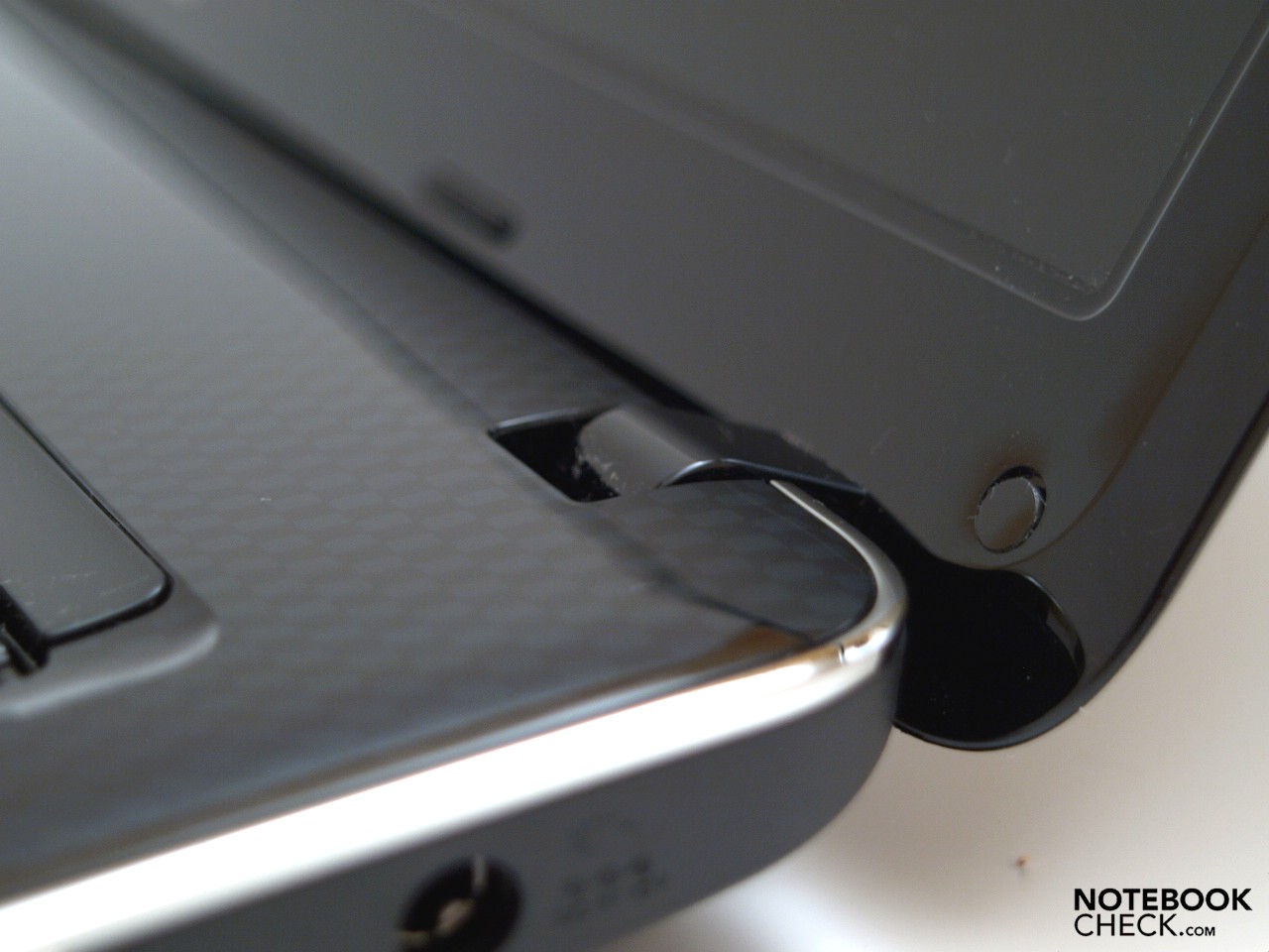 Mit ausschließlich Kunststoffoberflächen erweist sich die Basiseinheit als sehr verwindungsfest und ausreichend druckstabil. Die Handballenablagen geben allerdings auch unter leichtem Druck nach, wobei mitunter auch ein Knacken zu vernehmen ist. Der Akku sitzt auch nicht absolut fest im Gehäuse und kann leicht hin und her bewegt werden. Der sehr dünne Displaydeckel quittiert ein Anheben an einem Eck zwar nur mit mäßigen Verwindungen, dafür knarrt es teilweise. Bildveränderungen am eingeschalteten Bildschirm konnten dabei aber nicht beobachtet werden. Punktuelle Druckeinwirkung von außen kann der Bildschirmdeckel deutlich besser parieren.