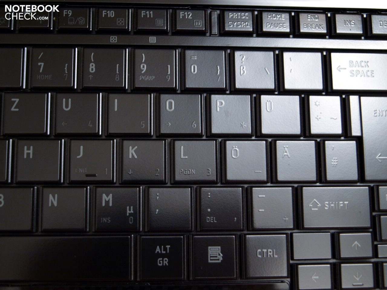 Laut Herstellerseite ist die Tastatur in Standardlayout in mattschwarz ausgeführt. Dies entspricht nicht unbedingt unserem Eindruck. Die Tasten sind zwar etwas weniger glänzend als die umliegenden Bauteile, doch wirken die glatten, haptisch nicht besonders ansprechenden Oberflächen, alles andere als matt. Mit den mechanischen Eigenschaften der einzelnen Tasten, mittellanger Hubweg und klarem Druckpunkt kann man zufrieden sein. Selbst bei energischem Tippen bleibt die Tastatur angenehm leise, dafür federt der Unterbau dabei etwas durch.