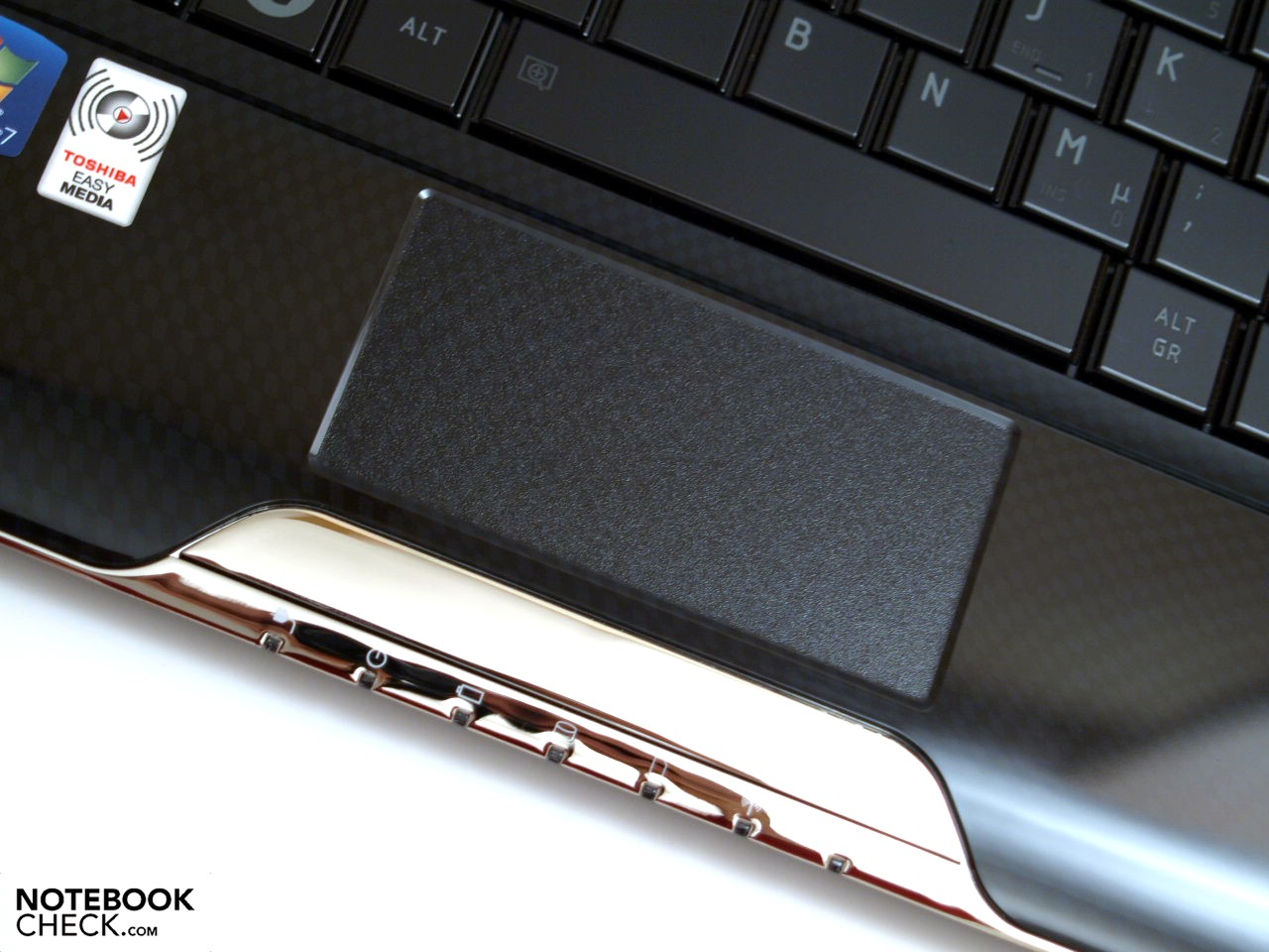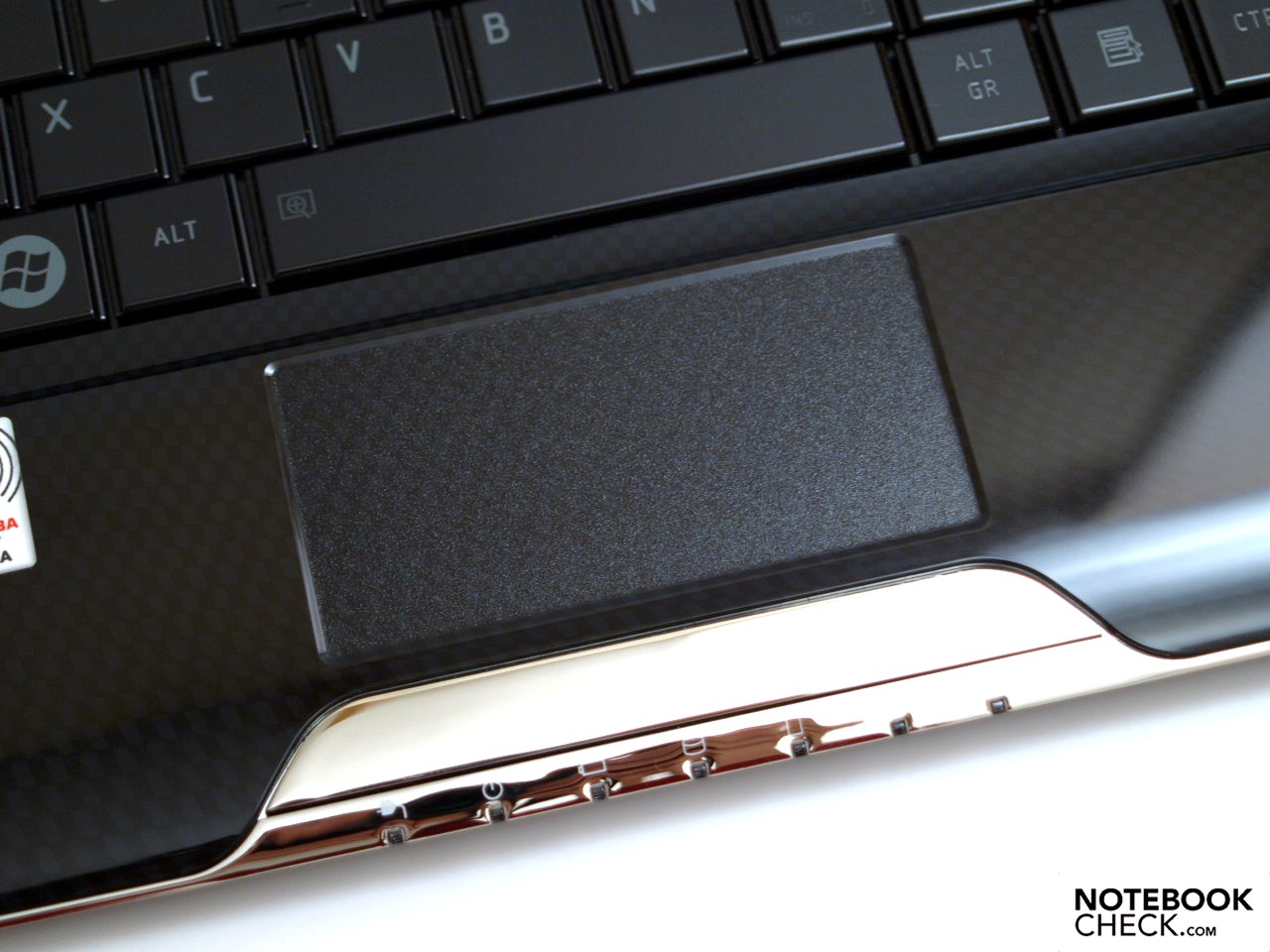Das Touchpad von 79 Millimetern Breite und 38 Millimetern Höhe liegt etwas tiefer als die umliegenden Bauteile und grenzt sich gut fühlbar durch eine abgeschrägte Kante von diesen ab. An seiner Oberfläche setzten sich Material und Textur der Handballenablagen fort, doch wurde die Oberfläche leicht angeraut. Dennoch ist seine Haptik nicht optimal. Solange man nicht versehentlich eines der unterstützten Multitouchfeatures oder den, weder optisch noch haptisch gekennzeichneten vertikalen Scrollbereich aktiviert, ist ein präzises Steuern der Mauszeigers möglich. Anfangs ist dies ziemlich nervend, doch nach etwas Eingewöhnungszeit kommt man auch mit diesem Touchpad ganz gut zurecht.
