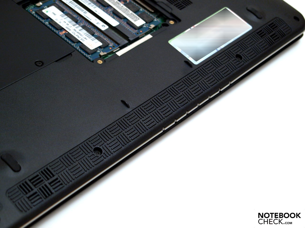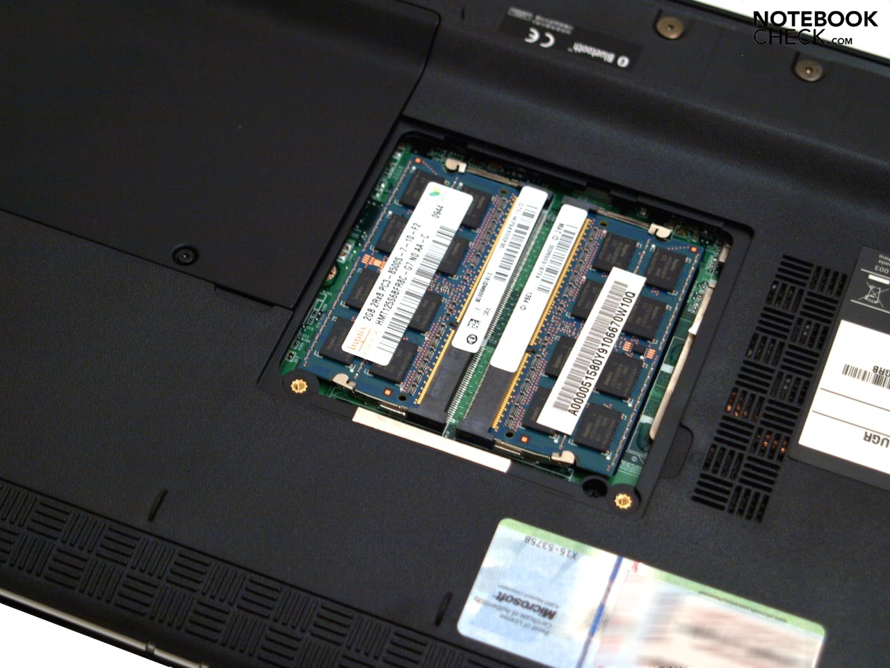 Unser Testgerät bietet mit gleich vier Gigabyte DDR3 RAM gleichzeitig auch die maximal mögliche Ausbaustufe. Aufgrund der vorinstallierten 64-Bit Version von Windows 7 Home Premium kann der Hauptspeicher auch effizient ausgenutzt werden (gesamter realer Speicher 3.84 GB). Weniger stark bestückte Modelle können bequem via Wartungsklappe an der Unterseite aufgerüstet werden.