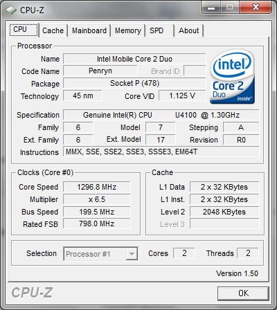 Bei der Ausstattung des Toshiba T130 wurde ein Hauptaugenmerk auf Energiesparen gelegt. Dennoch wurde nicht die absolut leistungsschwächste Hardware ausgewählt. Unserem Testgerät wurde sogar ein moderner energiesparsamer Zweikernprozessor spendiert, seines Zeichens eine Pentium SU4100 CPU von Intel (-> Herstellerlink) mit 2M Cache, 1.30 GHz und 800 MHz FSB. Die im 45-Nanometer-Verfahren hergestellte CPU weist mit 10 Watt eine moderate Verlustleistung auf. In Bezug auf CPU-Ausstattung gibt es aber, wie schon eingangs erwähnt, einige modellabhängige Varianten.