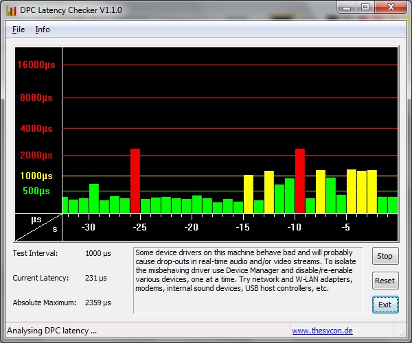 Die DPC-Latenzen geben die Verweildauer von DPCs (Dereffered Procedure Calls) in der DPC-Queue an. Aufgrund fehlerhafter Treiber können die Latenzen mitunter zu lange ausfallen und Probleme beim Anschluss externer Geräte, beispielsweise Soundknacken von externen Audiokarten, verursachen. Bei unserem Testgerät übersteigen die Latenzen immer wieder die 1000µs Marke, sodass solche wahrscheinlich sind. Durch selektives Deaktivieren einzelner Gerätetreiber kann man möglicherweise den oder die Verursacher auffinden und durch ein Treiberupdate das Problem beheben.