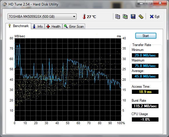 An Massenspeicher bietet das Toshiba Satellite T130 je nach Modell nur herkömmliche, aber unterschiedlich große, 5400 U/min Festplatten. Diese sind allerdings mittels Sensor vor Schäden durch Erschütterungen geschützt. In unserem Testsample befand sich im Detail eine MK5055GSX, wenig überraschend, ebenfalls von Toshiba. Die Leistungsdaten der Festplatte fallen sich unauffällig aus. An der Unterseite des Notebook befindet sich noch eine zweite Wartungsklappe. Aufgrund der Größe könnte man vermuten, dass sich dahinter die Festplatte befindet. Da diese aber mit Torxschrauben fixiert war, konnten wir dies mangels entsprechendem Schraubendreher nicht verifizieren.