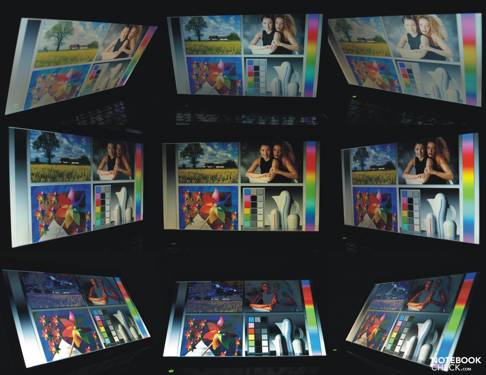 Die Blickwinkel zeigen im Vergleich zu den meisten Mitbewerbern keine großen Abweichungen. Wieder einmal ist der horizontale Arbeitsbereich relativ großzügig, wobei mit Abflachen des Sichtwinkels verstärkt mit Spiegelungen zu rechnen ist. In vertikaler Richtung ist der stabile Bereich klassenüblich sehr eng. Außerhalb dieses verschlechtert sich die Ablesbarkeit aufgrund von Kontrastverlusten und Farbveränderungen rapide.