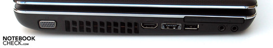 Nutzt man allerdings auch den angebotenen eSATA bzw. den digitalen HDMI Port, so muss man an der linken Gehäuseseite im vorderen Bereich mit einer Beeinträchtigung durch Stecker und Kabel rechnen. Speziell der HDMI Port, der in vielen Fällen den brav im hinteren Bereich positionierten VGA-Port überflüssig macht, ist dabei ein Dorn im Auge, bedenkt man die mangelnde Flexibilität eines gut geschirmten HDMI-Kabels.