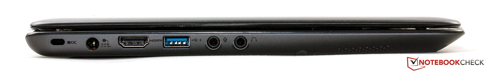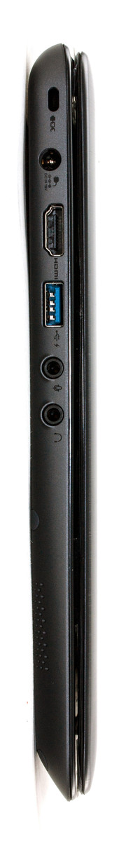 Die Anschlussausstattung bewegt sich auf dem normalen Niveau eines Ultrabooks. Der vorhandene USB-3.0-Port kann selbst im ausgeschalteten Zustand dafür genutzt werden, externe Geräte mit Strom zu versorgen. Dies muss jedoch erst im BIOS aktiviert werden. Der integrierte Kartenleser unterstützt Speicherkarten im SD-Format bis 64 GB (SDXC) sowie MMC-Karten bis 2 GB.