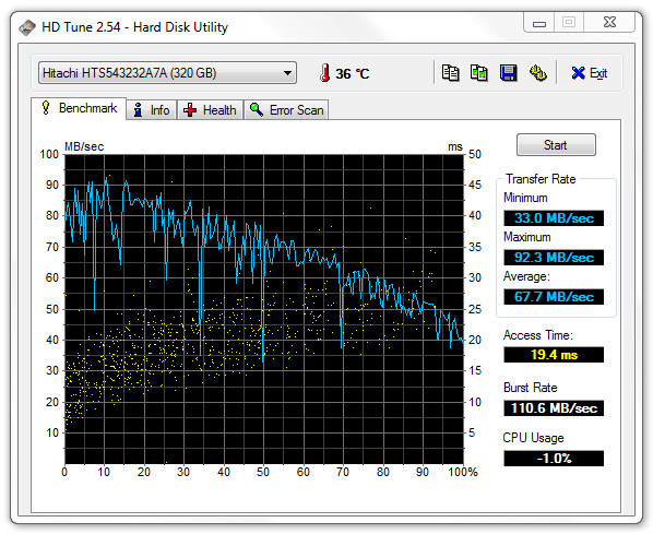 Die in unserem Vorseriengerät eingesetzte Hitachi-Festplatte (HTS543232A7A) präsentiert sich im HDTune Benchmarktest nicht gerade als einer der flottesten Vertreter seiner Art. Durchschnittliche Übertragungsraten von 67.7 MB/s und eine Zugriffszeit von 19.4 Millisekunden können auch von konventionellem Massenspeichern leicht getoppt werden. Solid State Drives spielen mit dreistelligen Übertragungsraten und einer Zugriffszeit im Millisekundenbereich ohnehin in einer anderen Liga. Dennoch, auch hier kommt es letztlich auf das genaue Modell an, wie gut oder schlecht dieses in verschiedenen Szenarios performt.