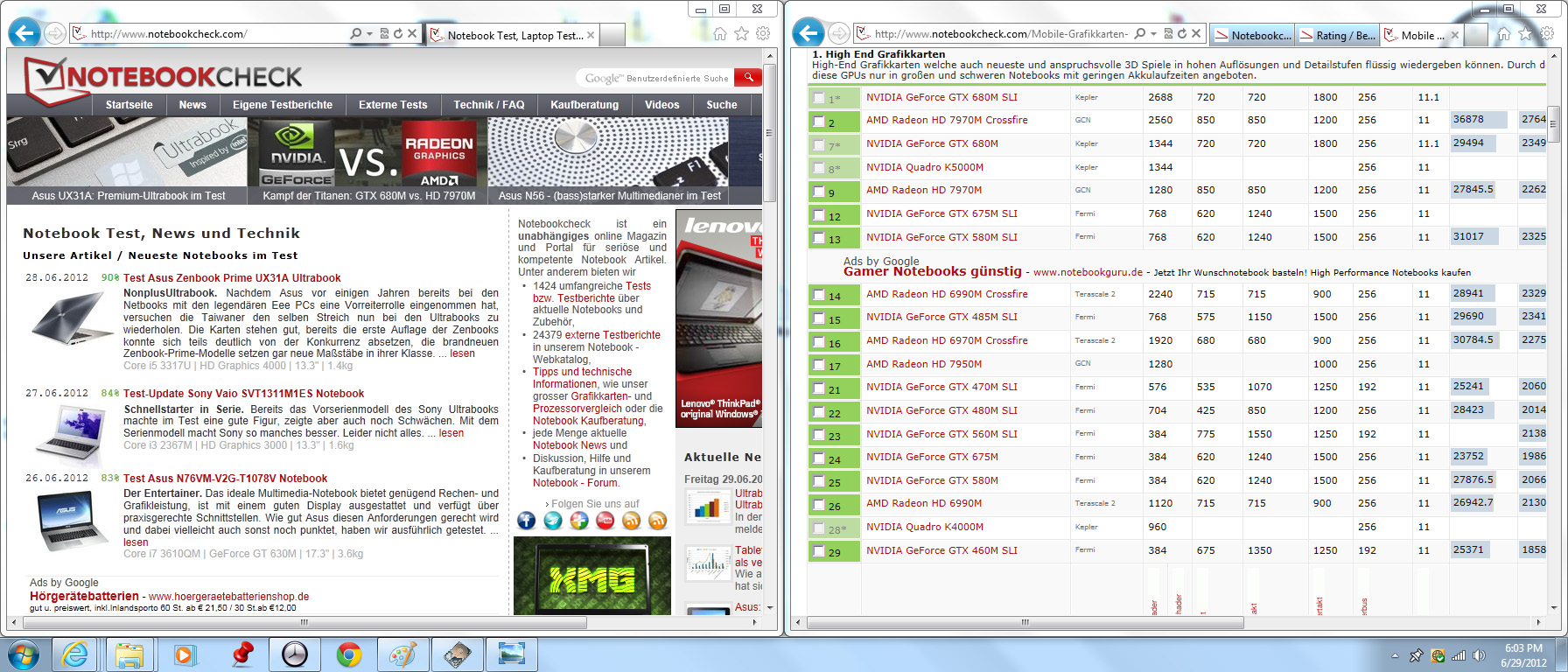 Mit der Verkleinerung des Fertigungsprozesses auf 22 Nanometer hat sich Intel auch der Überarbeitung der in den Prozessoren integrierten Grafikeinheit angenommen. Im Vergleich zum Vorgänger Intel HD 3000 kann die neue HD 4000 einen respektablen Performancezuwachs verbuchen. Im Falle des 3DMark Vantage Benchmarktests erreicht unsere Testkonfiguration etwa 3148 Punkte, liegt damit inmitten vergleichbar ausgestatteter Ultrabooks und kann die schnellsten Systeme mit der Intel HD Graphics 3000 Lösung um rund 50% überflügeln.