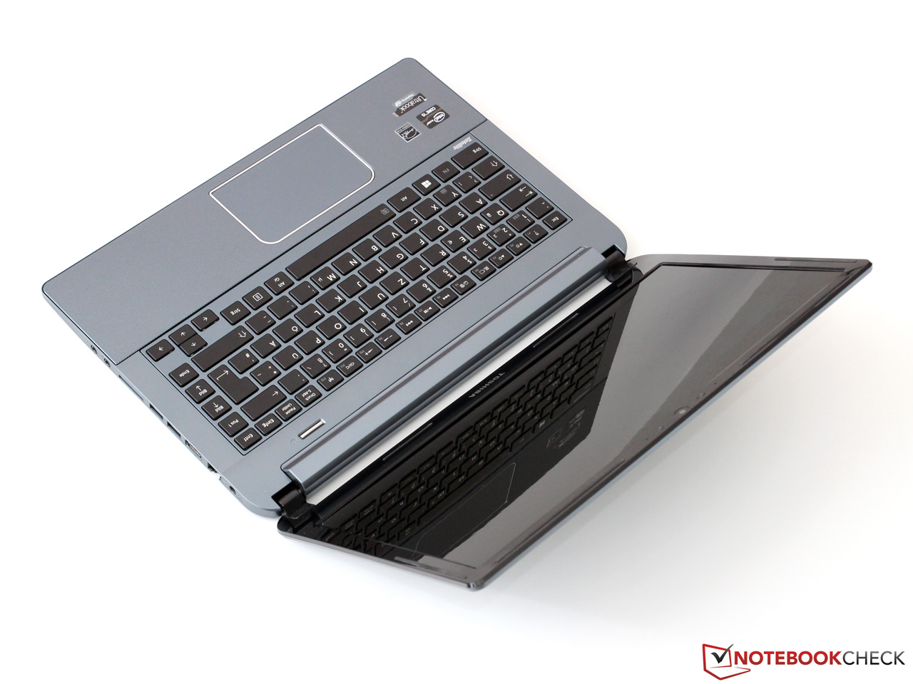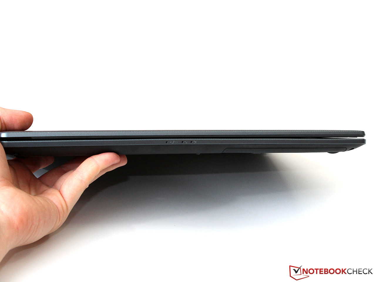 Dies wird durch den besonders schmalen Displayrahmen (ringsum etwa 14 Millimeter Breite) noch verstärkt, wodurch das Gehäuse ein wenig kompakter als bei vielen Kontrahenten ausfällt. Mit gerade einmal gut 1,7 kg Gewicht und 20,7 Millimetern Dicke lässt sich das Notebook einfach transportieren, auch wenn es nicht ganz mit den Modellen der 13,3-Zoll-Klasse konkurrieren kann: Diese sind oftmals noch einen halben Zentimeter dünner und mehrere hundert Gramm leichter.