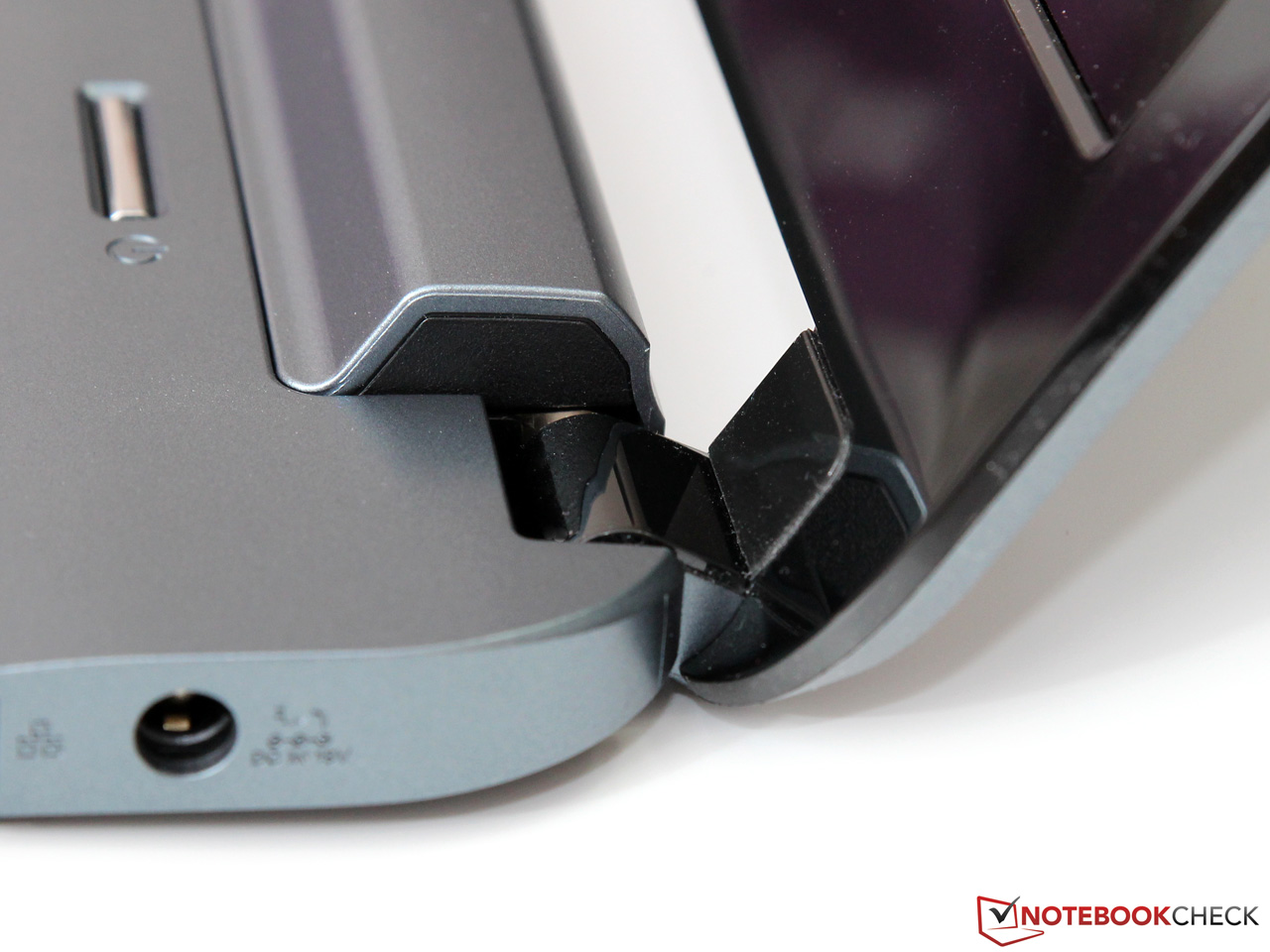 Der Verzicht auf solide Leichtmetalle bleibt nicht ohne Folgen für die Stabilität. An vielen Stellen lässt sich das Chassis mit leichtem Druck sichtbar eindellen, ohne dass dies den alltäglichen Gebrauch jedoch nennenswert einschränkt. Auch das Display zeigt nur eine mäßige Verwindungssteifigkeit und sollte besser mit einem mittigen, beidhändigen Griff geöffnet werden. Wie bei vielen Notebooks dieser Preisklasse schwingt der Deckel bei Erschütterungen rhythmisch mit, was nicht gerade für die Qualität der verbauten Scharniere spricht.