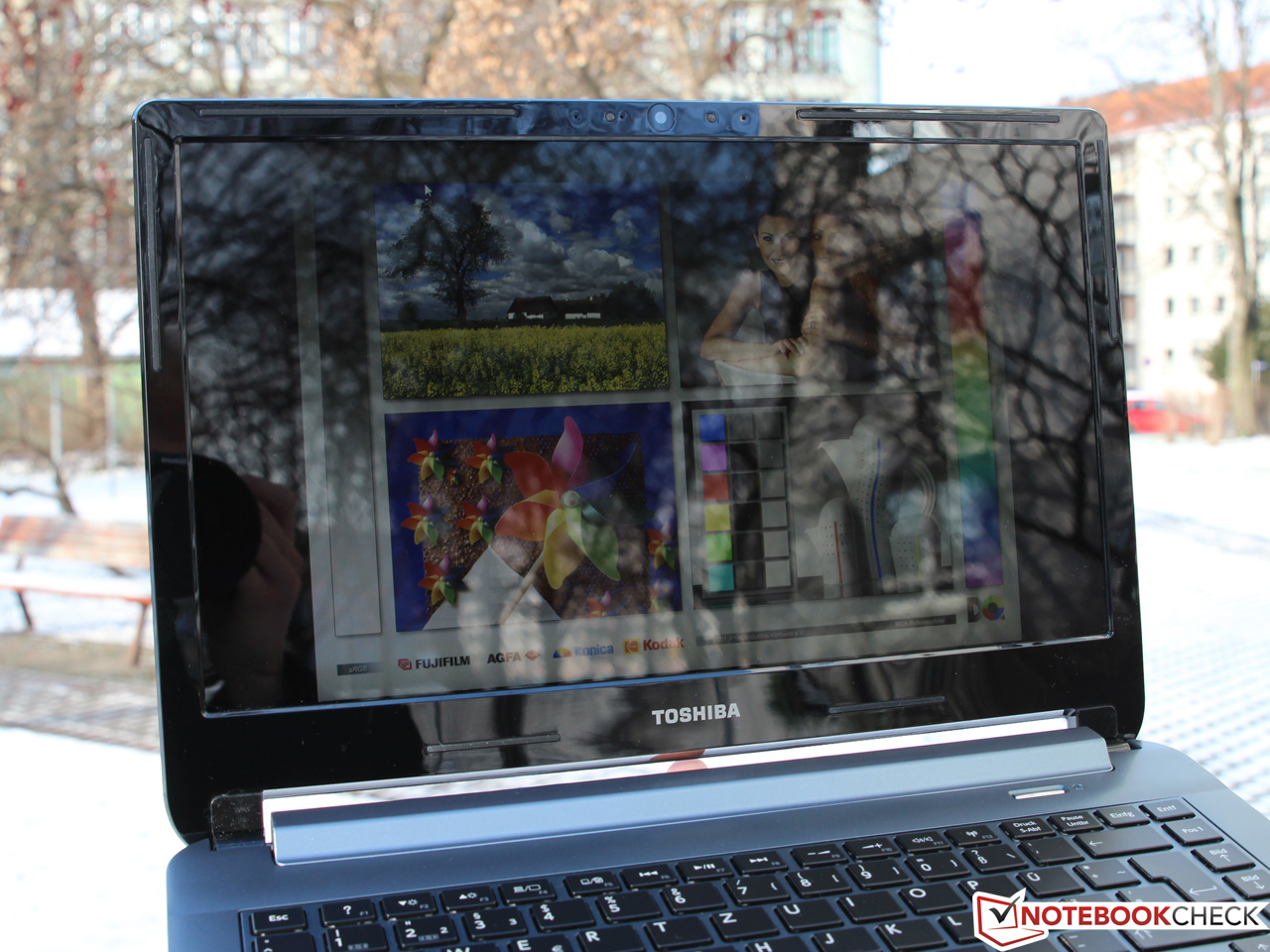 Wie zuvor bereits erwähnt, hat Toshiba ein sogenanntes Glare-Display mit verspiegelter Oberfläche verbaut. Während dies für eine subjektiv sattere Farbdarstellung sorgt, sind die Auswirkungen in vielen anderen Situationen vor allem negativ: Unter freiem Himmel ist das Notebook so nur eingeschränkt benutzbar. Die im Akkubetrieb um rund 20 % gedrosselte Displayhelligkeit verliert den Kampf gegen äußere Lichtquellen und fesselt den Anwender damit an den heimischen Schreibtisch.