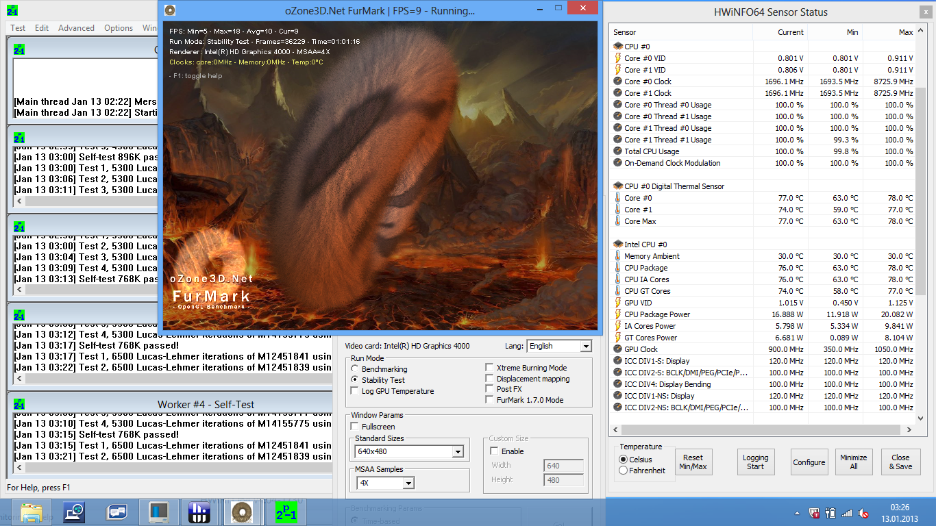 Erstaunlicherweise nicht: Auch nach unserem einstündigen Stresstest mit Prime95 und FurMark bleibt der Core i5-3317U deutlich unter 80 °C und hält seine Basistaktrate von 1,7 GHz. Die integrierte Grafikeinheit schwankt zwischen 900 und 1000 MHz und reizt damit ihren Turbo-Boost-Spielraum fast vollständig aus. Auch im Sommer sollte es deshalb nicht zu Taktdrosselungen kommen.