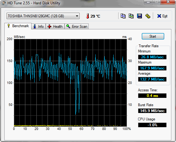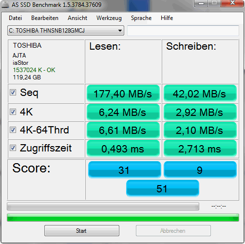 Hinter den HDD-Scores der System-Benchmarks stehen die Lese- und Schreibraten, welche wir mit HD Tune, Crystal Disk Mark und AS SSD ermitteln. Die SSD liest laut den Tests mit 133 bis 184 MB/s aus dem Speicher. Die Lese/Schreibraten von 4K-Datenblöcken können nicht ganz überzeugen.