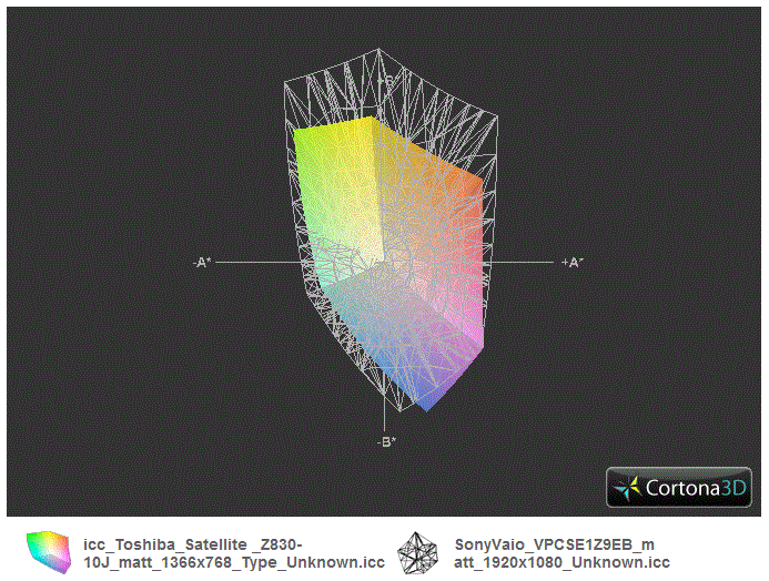 Der schwache Kontrast von 136:1 lässt Farben, einhergehend mit der matten Paneloberfläche, eher blass und eintönig wirken. Ein schwarzer Hintergrund wirkt daher nicht tiefschwarz, sondern hat einen grauen Schleier. Für den Büro- oder Outdoor-Einsatz geht das in Ordnung. Wer aber in Sachen Display-Panel anspruchsvoll ist und gar einen großen Farbraum sucht, der wird enttäuscht. sRGB ist deutlich verfehlt (Bild in der Mitte). Ein Business-Laptop wie das Sony Vaio SE1Z9EB hat in dieser Hinsicht mehr auf dem Kasten, auch wenn sRGB selbst vom Vaio Panel nicht abgedeckt wird.