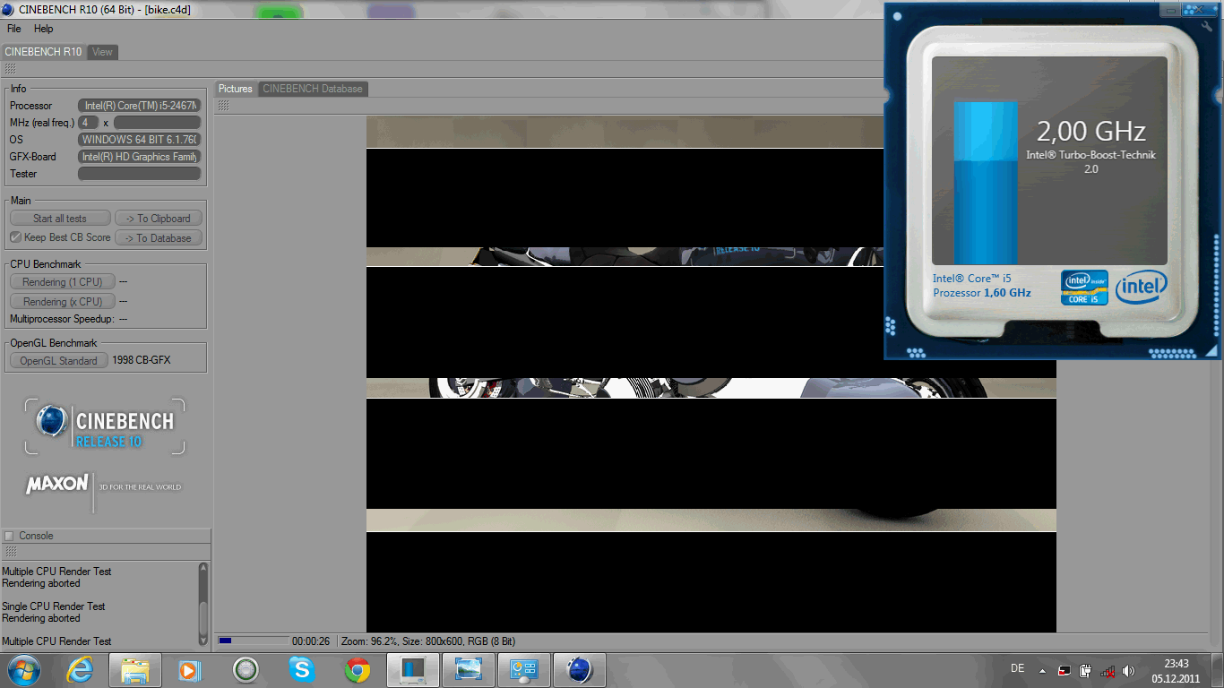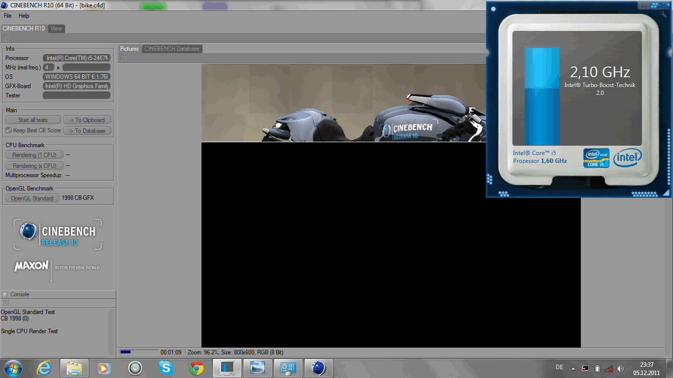 Der Prozessor-Test Cinebench R11.5 (64 Bit, Multi-Core-Rechnen) vergibt an das Z830 1.91 Punkte. Dies gilt für Wiederholungen und auch für den Akkubetrieb (jeweils 3 Durchläufe). Der 2620M ist mit 3.03 Punkten dabei, der i7 2677M aus dem UX21E mit 2.13 Punkten. Unser Ultrabook mit der Core i5-CPU liegt demnach nur minimal unter der Rechengeschwindigkeit eines Core i7 ULV-Prozessors. Bei normalen Laptop-Prozessoren kann er aber nur mit der Klasse Core i3 2330M (2.1 Punkte) knapp mithalten.