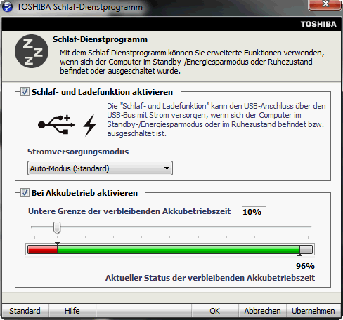 Ein Intel Core Prozessor im Verbund mit einem WLAN-Modul desselben Herstellers bringt Wireless Display mit: Sofern ein TV-Gerät mit diesem Feature in Reichweite ist, kann die Intel HD Graphics 3000 die bunten Pixel an selbigen senden. USB-Ports, die auch bei abgeschaltetem Notebook das Smartphone oder den iPod laden, gibt es viele. Toshiba gibt dazu noch ein Tool an die Hand, in welchem diese Funktion exakt eingestellt werden kann (minimaler Ladestand).