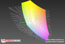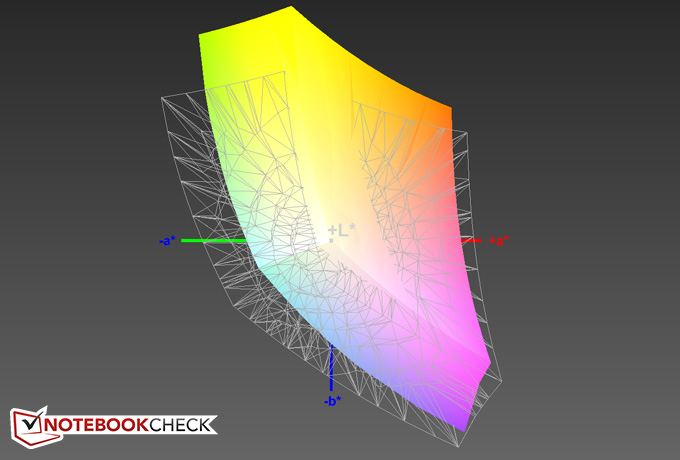 Mit 73,48% fällt die Abdeckung des sRGB-Farbraums eher durchschnittlich aus, wobei die Abdeckung im grün-gelben Bereich den Vergleichsfarbraum insgesamt übersteigt. Dementsprechend erreicht das Panel auch beim Vergleich mit dem AdobeRGB-Farbraum einen Wert von 53,94%. Die Abdeckung des Farbraums ist allerdings nur für professionelle Grafikbearbeiter von Relevanz – diese sollten zu einem anderen Gerät greifen.