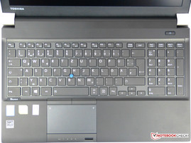 Toshiba verbaut bei unserem Testgerät nicht nur ein traditionelles Touchpad, sondern setzt zusätzlich auf einen Trackpoint, der in ähnlicher Form auch in vielen anderen Business-Geräten zu finden ist. Um die Bedienung dieses Eingabegeräts zu erleichtern, wurden die Touchpad-Tasten zwischen das Pad und die Tastatur verlegt.