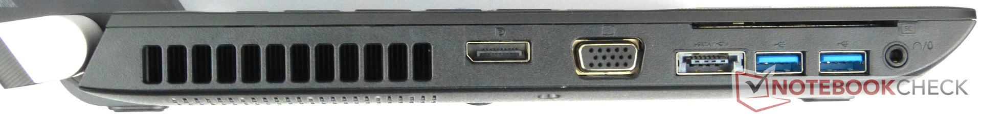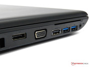 Als Business-Notebook bietet das Toshiba Tecra A50-A-12Z eine Reihe von Anschlüssen, die bei Consumer-Geräten meist nicht zu finden sind. Dazu gehört nicht nur der DisplayPort-Anschluss, auch ein kombinierter eSATA / USB-2.0-Port lässt sich auf der linken Seite finden.