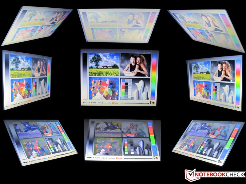 Die möglichen Blickwinkel lassen deutlich zu wünschen übrig. Sitzt man gerade vor dem Display, so sind der Kontrast und die Farbqualität sehr gut. Auch seitliche Einblicke sind gut möglich, solange das Display nicht zusätzlich gekippt oder geneigt wird. Sehr schnell invertiert das Bild beziehungsweise hellt auf, wenn das Display einen zusätzlichen Neige-/Kippwinkel bekommt.