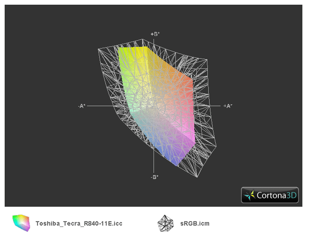 Der Farbraum des Displays, welcher vor allem bei Anwendungen wie zum Beispiel DTP, CAD oder Bildbearbeitung besonders wichtig wird, ist von der Referenz Adobe RGB (t) und Apple RGB(t) weit entfernt, gleiches gilt auch für sRGB (t).