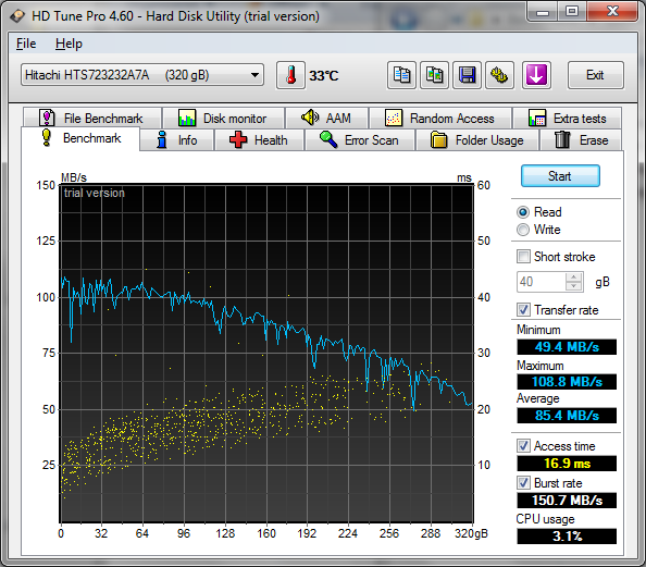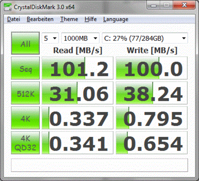 Die durchschnittliche Transferrate lag im Test bei 108,8 MB/s, gemessen mit HD-Tune. Mit CystalDiskMark 3.0 konnten wir der Platte etwas weniger entlocken. CystalDiskMark 3.0 ermittelte einen Wert von rund 101 MByte/s, wobei wir hierfür fünf Durchläufe durchführten. Die Burst-Rate lag im Test bei 150,7 MB/s bei einer CPU-Belastung von 3,1 Prozent.