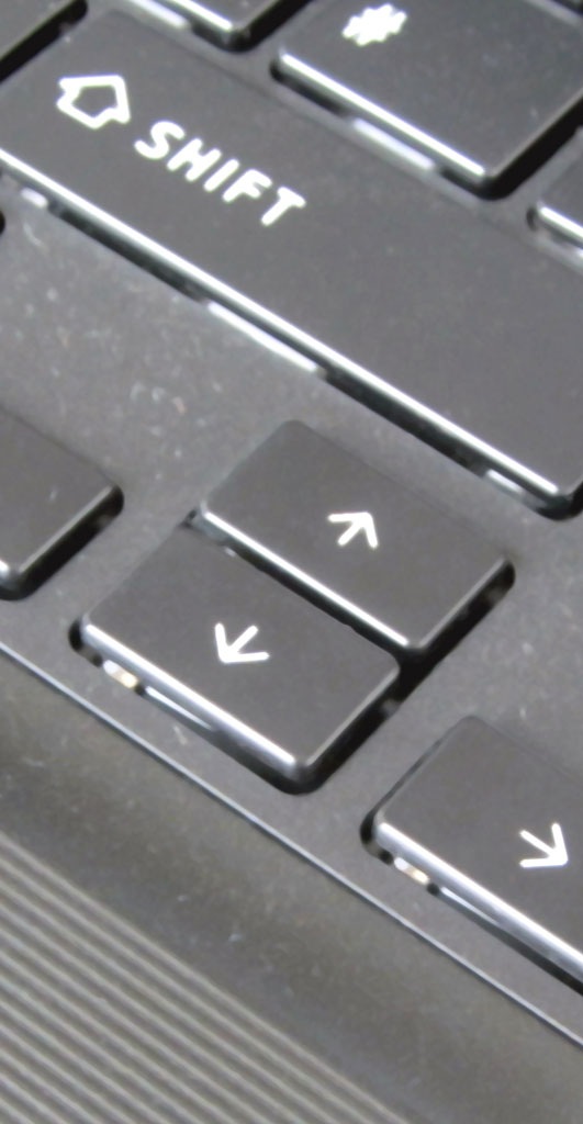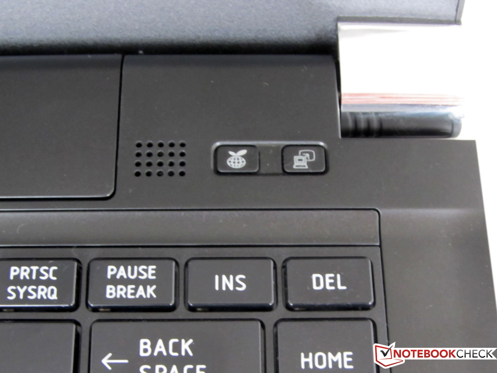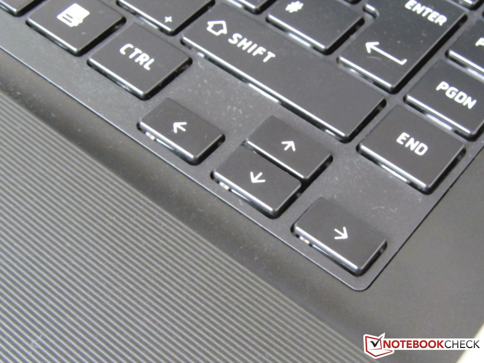 Die vier Richtungstasten fallen beim Tecra R840-11E sehr klein aus und befinden sich auf der gleichen Ebene wie die restliche Tastatur. Beim Layout hat sich Toshiba auf die wesentlichen Tasten beschränkt. Über zwei Short-Cut-Tasten lassen sich das Eco-Utility und die Wireless-Display-Funktion aufrufen. Die beiden Tasten lassen sich nicht mit anderen Funktionen belegen.