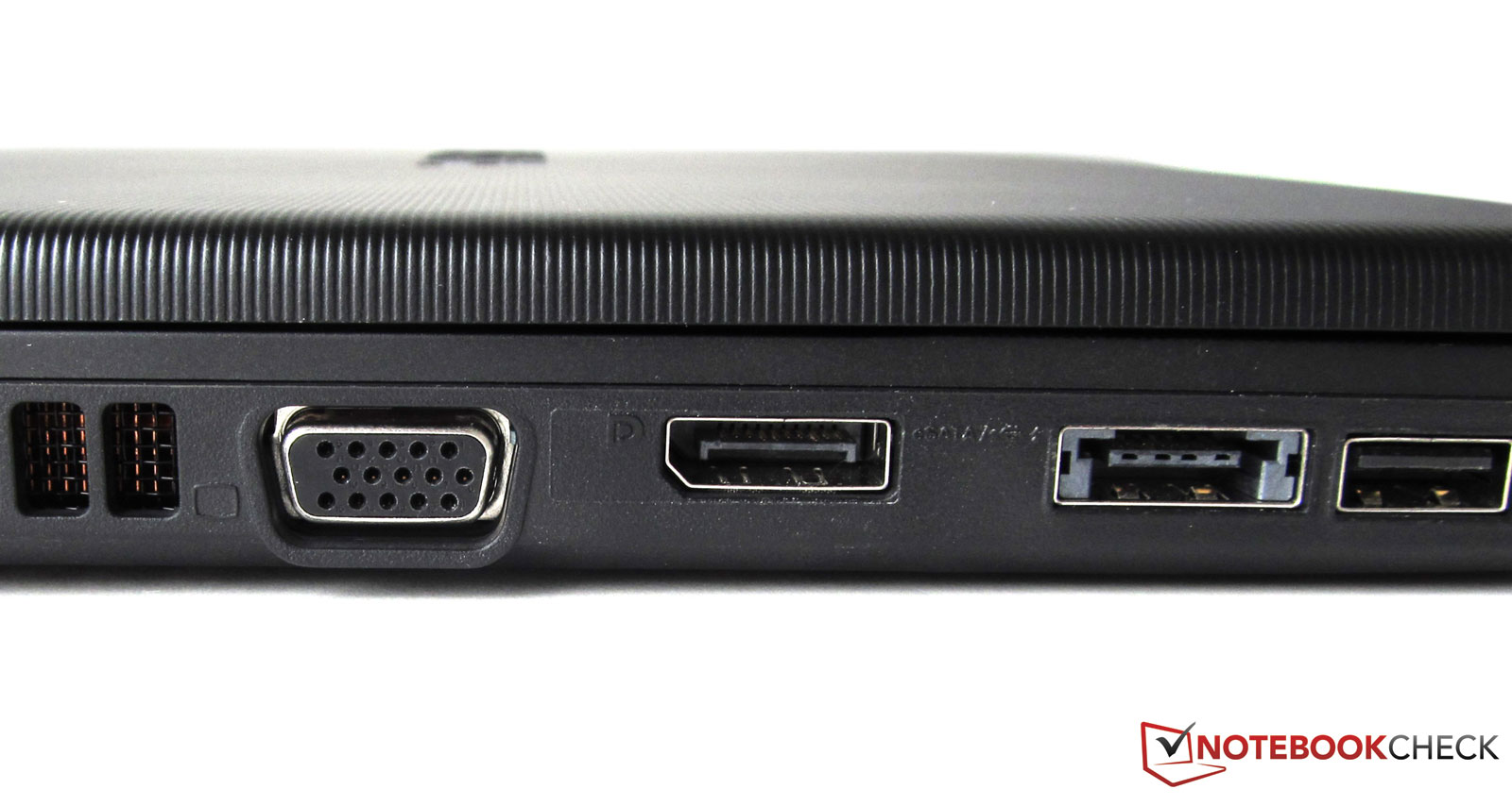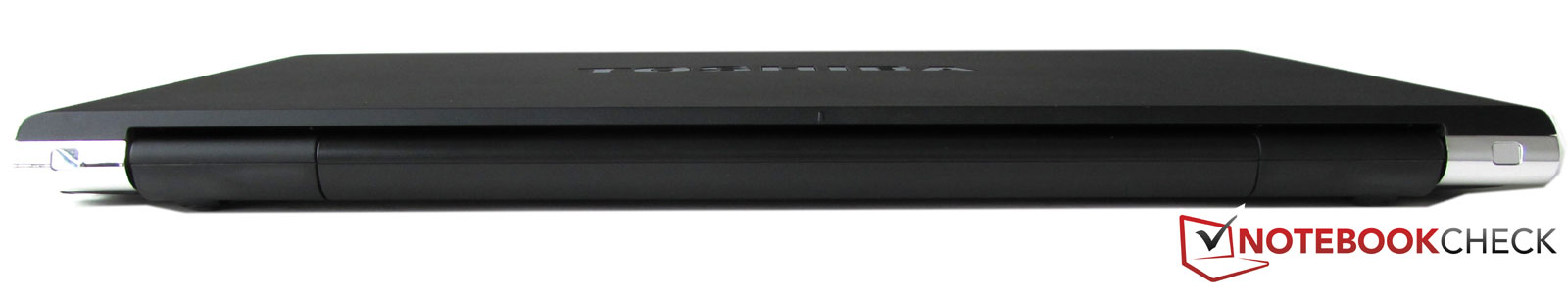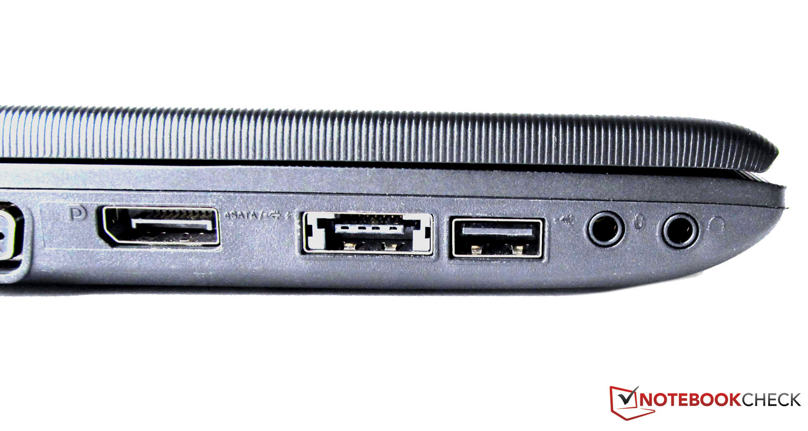 Bei dem 14-Zoll-Notebook von Toshiba geht es seitlich sehr beengt zu. Die Schnittstellen hat der Hersteller bei diesem Modell nur rechts und links angebracht. Weder auf der Vorder- noch auf der Rückseite sind Anschlüsse oder Buchsen vorzufinden. Auf der linken Seite gibt es zwei Audio-Buchsen, eine SATA/USB 2.0-Combo-Buchse mit USB Sleep-and-Charge-Funktion, je einen DisplayPort-/VGA- und den DC-IN-Anschluss. Auch rechts geht es recht eng zu was Anschlüsse angeht. Hier sind zu finden: ein DVD-Brenner, ein Smartcard-Slot, der Kartenleser für SD/MMC-Speicherkarten, der Express Card Steckplatz (34 mm), eine USB 3.0-Buchse und der Gigabit-LAN-Anschluss (RJ-45). Außerdem gibt es einen Audio-Ein- und Ausgang, eine eSATA/USB-Combo-Schnittstelle, eine USB 2.0-Buchse und einen Display-Port-Anschluss.