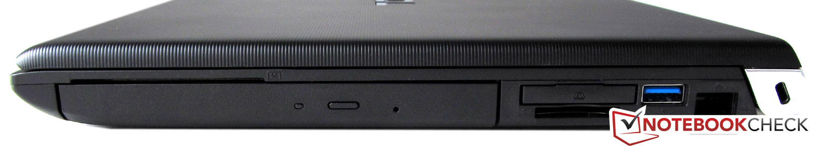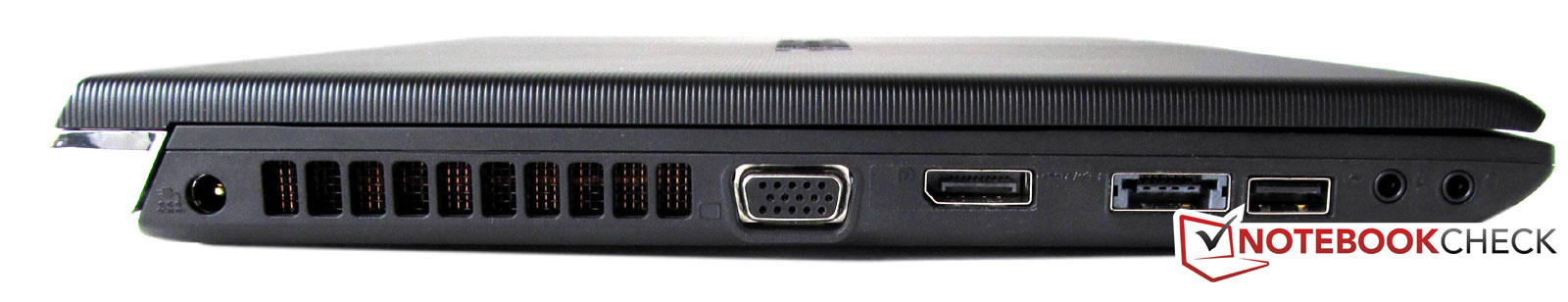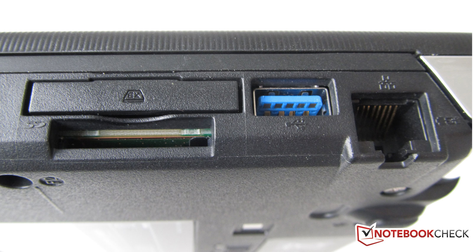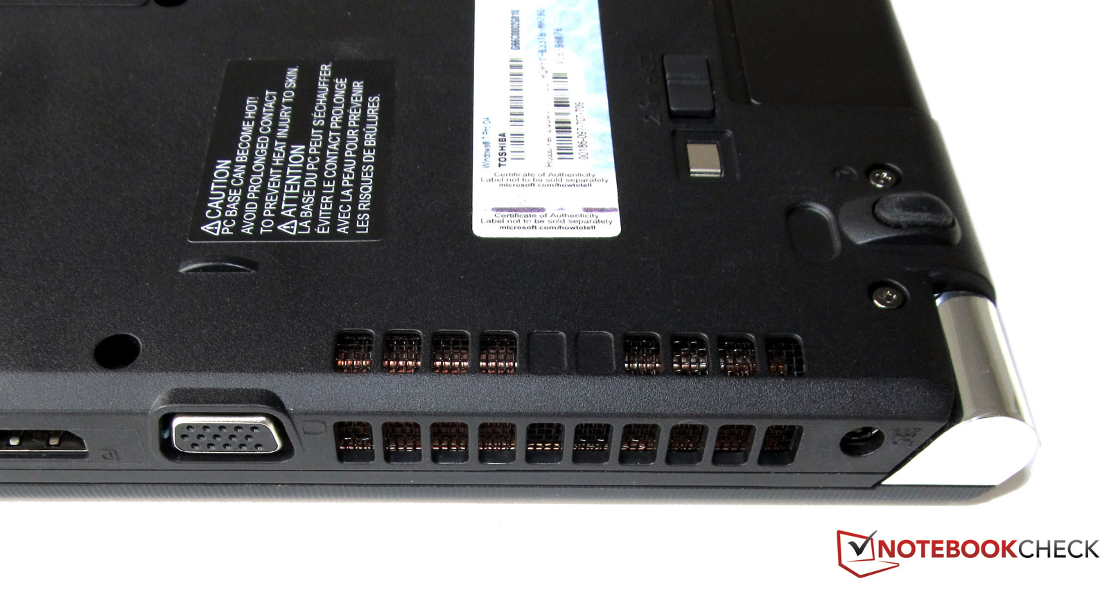 Bei dem 14-Zoll-Notebook von Toshiba geht es seitlich sehr beengt zu. Die Schnittstellen hat der Hersteller bei diesem Modell nur rechts und links angebracht. Weder auf der Vorder- noch auf der Rückseite sind Anschlüsse oder Buchsen vorzufinden. Auf der linken Seite gibt es zwei Audio-Buchsen, eine SATA/USB 2.0-Combo-Buchse mit USB Sleep-and-Charge-Funktion, je einen DisplayPort-/VGA- und den DC-IN-Anschluss. Auch rechts geht es recht eng zu was Anschlüsse angeht. Hier sind zu finden: ein DVD-Brenner, ein Smartcard-Slot, der Kartenleser für SD/MMC-Speicherkarten, der Express Card Steckplatz (34 mm), eine USB 3.0-Buchse und der Gigabit-LAN-Anschluss (RJ-45). Außerdem gibt es einen Audio-Ein- und Ausgang, eine eSATA/USB-Combo-Schnittstelle, eine USB 2.0-Buchse und einen Display-Port-Anschluss.