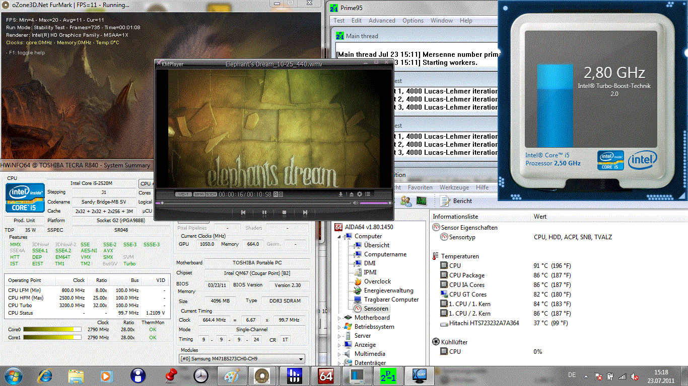 Zum Vergleich: Das HP Probook 6460b, welches ebenfalls mit einem 14-Zoll-Display, Intel Core i5 2520M und einer HD Graphics 3000 ausgestattet ist, erzielte in diesen Benchmarks deutlich bessere Werte: CB R10 Single: 5051, CB R10 Multi: 10554. der größere Bruder, das Toshiba R850-11P (i5-2410M CPU) kam beim Cinebench R10 auf 4521 (Single Test) beziehungsweise 9460 Punkte (Multi-Core).