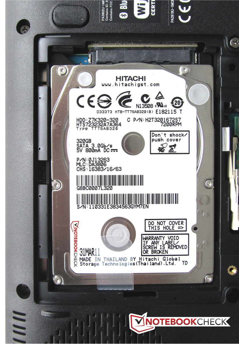 Als Festplatte kommt im Tecra R840-11E eine 2,5-Zoll-Platte von Hitachi zum Einsatz. Die HTS723232A7A364 liefert eine Speicherkapazität von brutto 320 GByte. Mit einer Arbeitsgeschwindigkeit von 7.200 Umdrehungen pro Minute und dem SATA-II-Interface bewegt sich die HTS723232A7A364 im gehobenen Bereich.