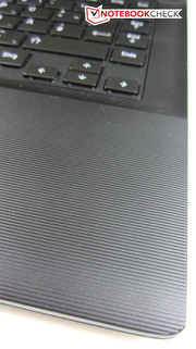 Im aufgeklappten Zustand kommen eine schlichte schwarze Tastatur und ein 8,5 x 5 Zentimeter großes Touchpad zum Vorschein. Obwohl das Chiclet-Keyboard laut Hersteller schmutzabweisend ist, versammeln sich mit Staub und Fingerabdrücken relativ schnell die üblichen Verdächtigen auf der Oberfläche. Besonders deutlich zeigt sich das auf dem Touchpad, mit seinen silbernen Tasten, und auf der mit dem Linienprofil verzierten Gehäuseoberfläche.