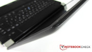 Der Displaydeckel lässt sich leicht mit einer Hand öffnen. Ohne großen Kraftaufwand und ebenfalls mit einer Hand kann man das Display an der Oberseite verdrehen. Solche Experimente sind aber nur innerhalb eines sehr kleinen Rahmens möglich. Bereits bei geringer Verwindung setzt der Displayrahmen allen Biegeversuchen deutlichen Widerstand entgegen.