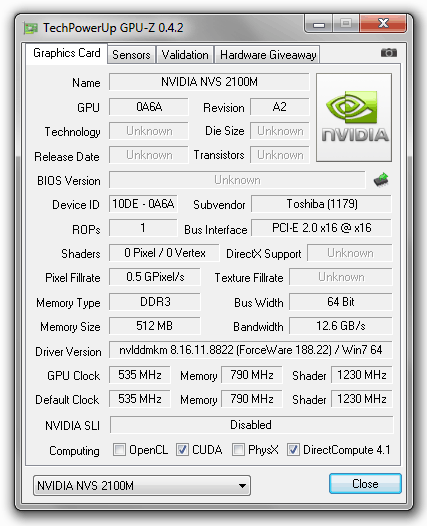 Letzteres erklärt sich dadurch, dass die NVS 2100M auf der G210M basiert und damit auch die gleichen Features wie ihr Consumer-Kollege mit sich bringt. Zu nennen wären etwa Purevideo HD zur Dekodierung von HD Videos (H.264, VC-1, MPEG-2, MPEG-4 ASP), CUDA und DirectX Compute. Im Gegensatz zu ihrer Mainstream-Variante ist die NVS 2100M mit speziellen Treibern auf Stabilität optimiert, wodurch diese auch nicht an die gaming performance von dieser heran kommt. Vorteil ist allerdings die garantierte Kompatibilität mit diverser Business-Software.