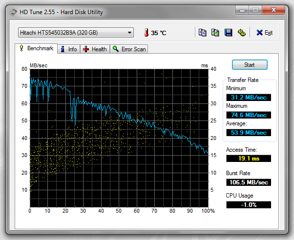 Im Toshiba Tecra S11 verrichtet eine Festplatte von Hitachi mit einer Bruttokapazität von 320 Gigabyte und einer Geschwindigkeit von 5400 Umdrehungen pro Minute ihren Dienst. Die mittels HDTune beobachteten Übertragungsraten bleiben im erwarteten durchschnittlichen Bereich. Etwas ungünstig fällt die Zugriffszeit von 19.1 Millisekunden aus.