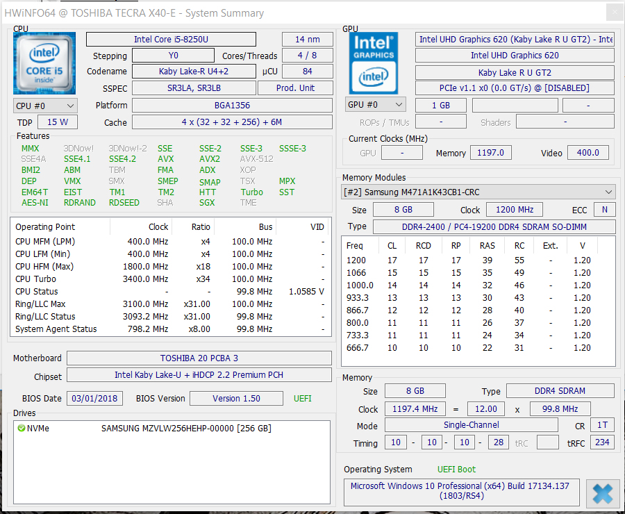 Toshiba setzt bei den Tecra-X40-E-Modellen auf Vierkernprozessoren der Kaby-Lake-Refresh-Generation. Damit wäre auch schon die einzige Neuerung im Vergleich zu den Tecra-X40-D-Modellen gefunden. Letztere sind mit Kaby-Lake-Zweikernprozessoren bestückt. Unser Testgerät hat einen Intel Core i5-8250U Vierkernprozessor an Bord. Es handelt sich hierbei um ein ULV-Modell (TDP: 15 Watt), das in allen gängigen Anwendungsbereichen eine gute Figur abgibt. Der Prozessor arbeitet mit einer Basisgeschwindigkeit von 1,6 GHz. Mittels Turbo ist eine Steigerung auf bis zu 3,4 GHz möglich.