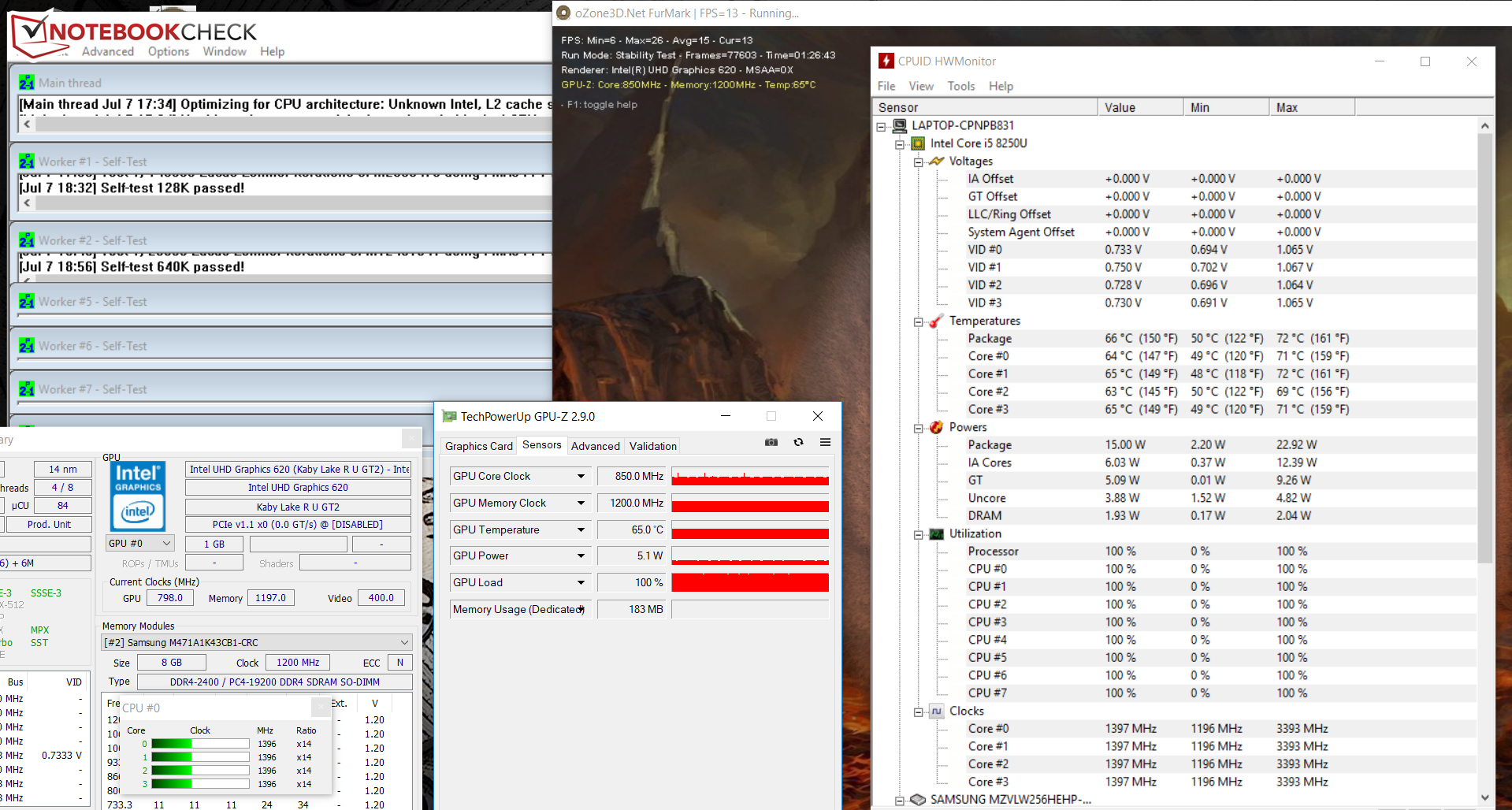 Der verbaute Core i5-8250U Vierkernprozessor sorgt für genügend Rechenleistung in allen gängigen Anwendungsbereichen. Allerdings kann er seine volle Rechenleistung nur bei Single-Thread-Anwendungen entfalten. Bei Multi-Thread-Anwendungen kann der Turbo nur bedingt ausgefahren werden. Das sieht bei Konkurrenz-Notebooks, die mit der gleichen CPU bestückt sind, aber nicht anders aus.