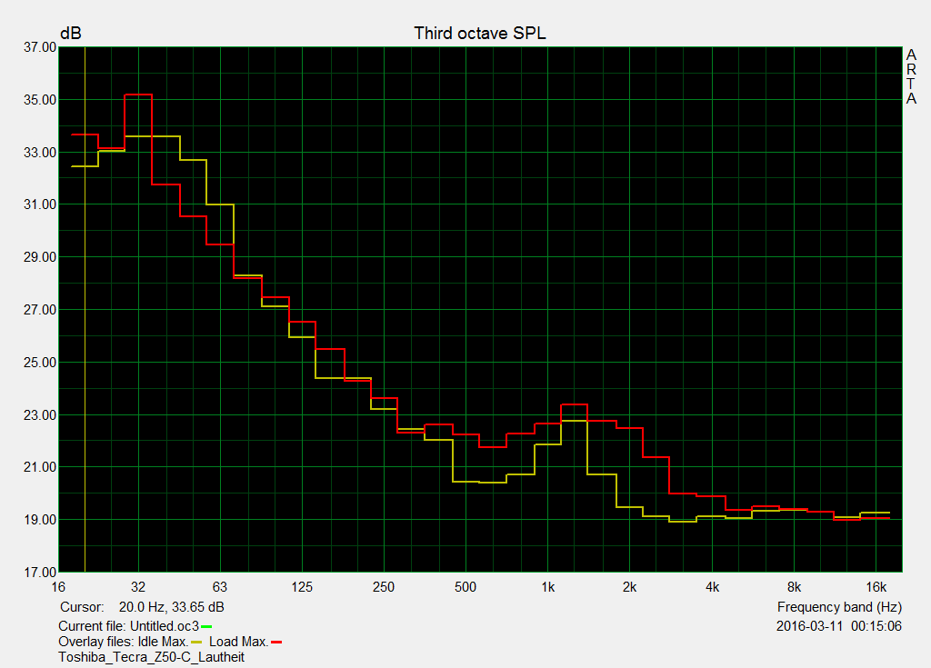 In Sachen Wärmemanagement haben die Ingenieure von Toshiba recht gute Arbeit geleistet. Die Temperatur im Leerlauf liegt nur geringfügig oberhalb einer normalen Zimmertemperatur. Unter erzwungener Maximalbelastung über längere Zeit hinweg (die bei „typischer“ Nutzung niemals auftreten dürfte) wird das Tecra im Bereich des Lüftungsschachtes (hinten rechts) dagegen ziemlich heiß. Die Handballenauflage und ein Großteil des Tastaturbereichs erwärmen sich allerdings weit weniger stark – solange das Gerät unter Volllast auf dem Schoß betrieben werden soll, dürfte es keine Probleme mit der Temperaturentwicklung geben.