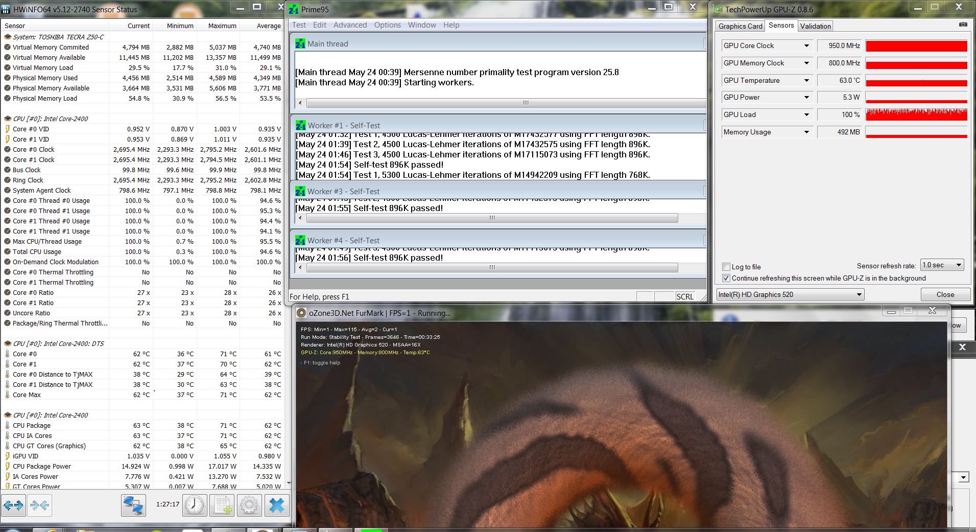 Im Stresstest schlägt sich das Z50 sehr gut: Die CPU erwärmt sich maximal auf 60 Grad und ist damit in der Lage, durchgehend oberhalb des spezifizierten Basistaktes von 2,3 GHz bzw. im Turbomodus zu arbeiten. Die Taktfrequenz schwankt zwischen 2,4 und den (bei Zweikernbetrieb) maximalen 2,7 GHz - von Throttling also keine Spur.