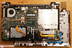 Zuletzt erlaubt das Tecra Z50 grundsätzlich auch die Wartung durch den Benutzer – allerdings ist hierfür die Entfernung der Bodenabdeckung nötig, und die wird von nicht weniger als 25 Schrauben an ihrem Platz gehalten. Davon sind einige zudem durch Aussparungen „separater“ Bauteile geführt und halten diese in Position. Ohne die Schrauben hängt etwa die Platine rechts unten im Bild, auf der zwei USB-Anschlüsse sowie der Audio-Port sitzen, nur noch an zwei dünnen Datenkabeln; leichte Wartbarkeit scheint kein Kriterium bei der Konstruktion des Gerätes gewesen zu sein.