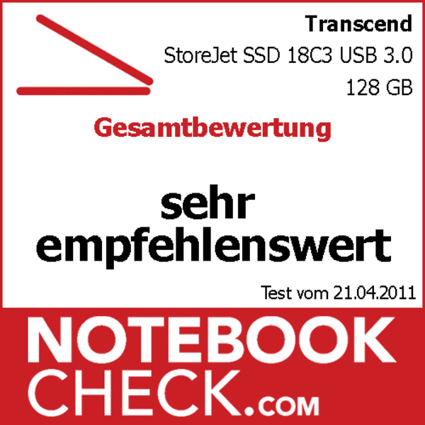 Transcend packt mit der StoreJet TS128GSSD18C3 die Probleme konsequent an und entfernt die beiden Leistungsbremsen. Die herkömmliche Festplatte wird durch ein Solid State Drive mit 128 GB Kapazität ersetzt und als Schnittstelle kommt USB 3.0 zum Einsatz. Das Gehäuse ist zudem besonders robust und stoßfest ausgeführt, wiegt ohne Kabel 70g und kann seine Stromversorgung wie gewohnt per USB bestreiten (Y-Kabel).