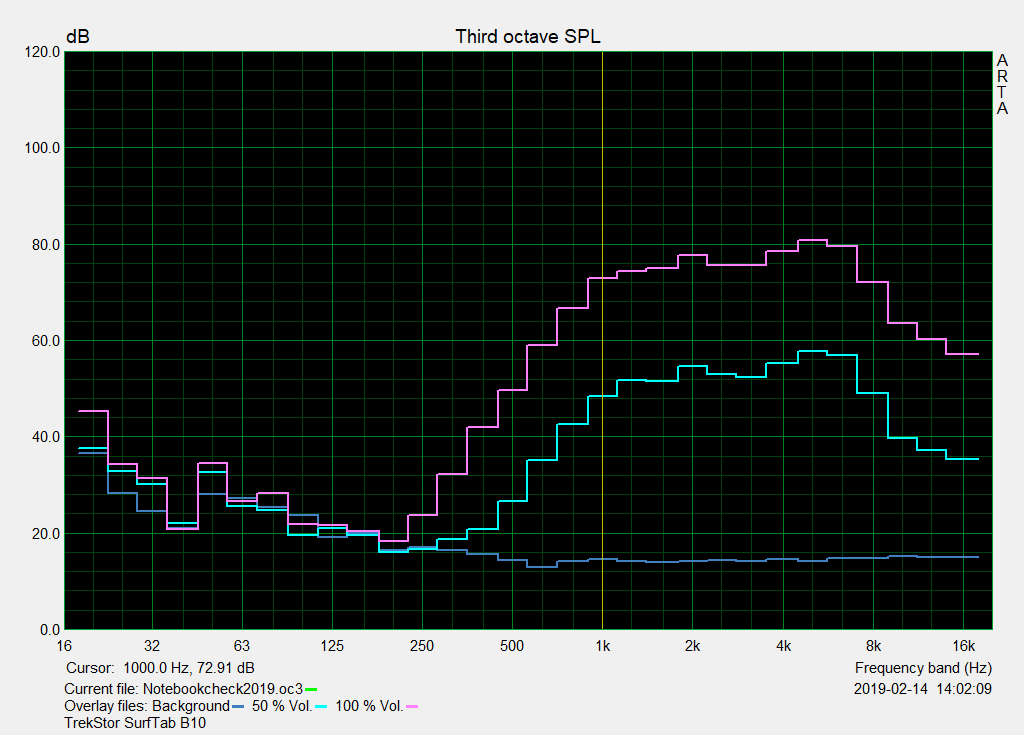 Die Stereo-Lautsprecher des Surftab B10 bieten eine relativ hohe Lautstärke, das Klangspektrum ist aber etwas unausgeglichen. Die Töne konzentrieren sich auf die hohen Mitten und die unteren Höhen, wodurch ein kraftloser Klang entsteht. Für seltene Medienwiedergaben sind die Lautsprecher dabei gerade noch geeignet, es sollten aber externe Lautsprecher oder Kopfhörer bevorzugt werden.