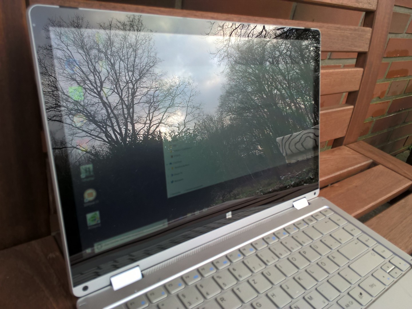 Im Außenbereich ist das Primbook C13 fast nicht zu gebrauchen. Die Umgebung spiegelt sich so stark im Display wider, dass Bildschirminhalte kaum noch erkannt werden können. Das Display unseres Testgeräts glänzt aber nicht nur in der Sonne, sondern auch bei der Farbraumdarstellung. In dieser Preisklasse deckt kein anderes Gerät den sRGB-Farbraum mit über 90 Prozent ab.