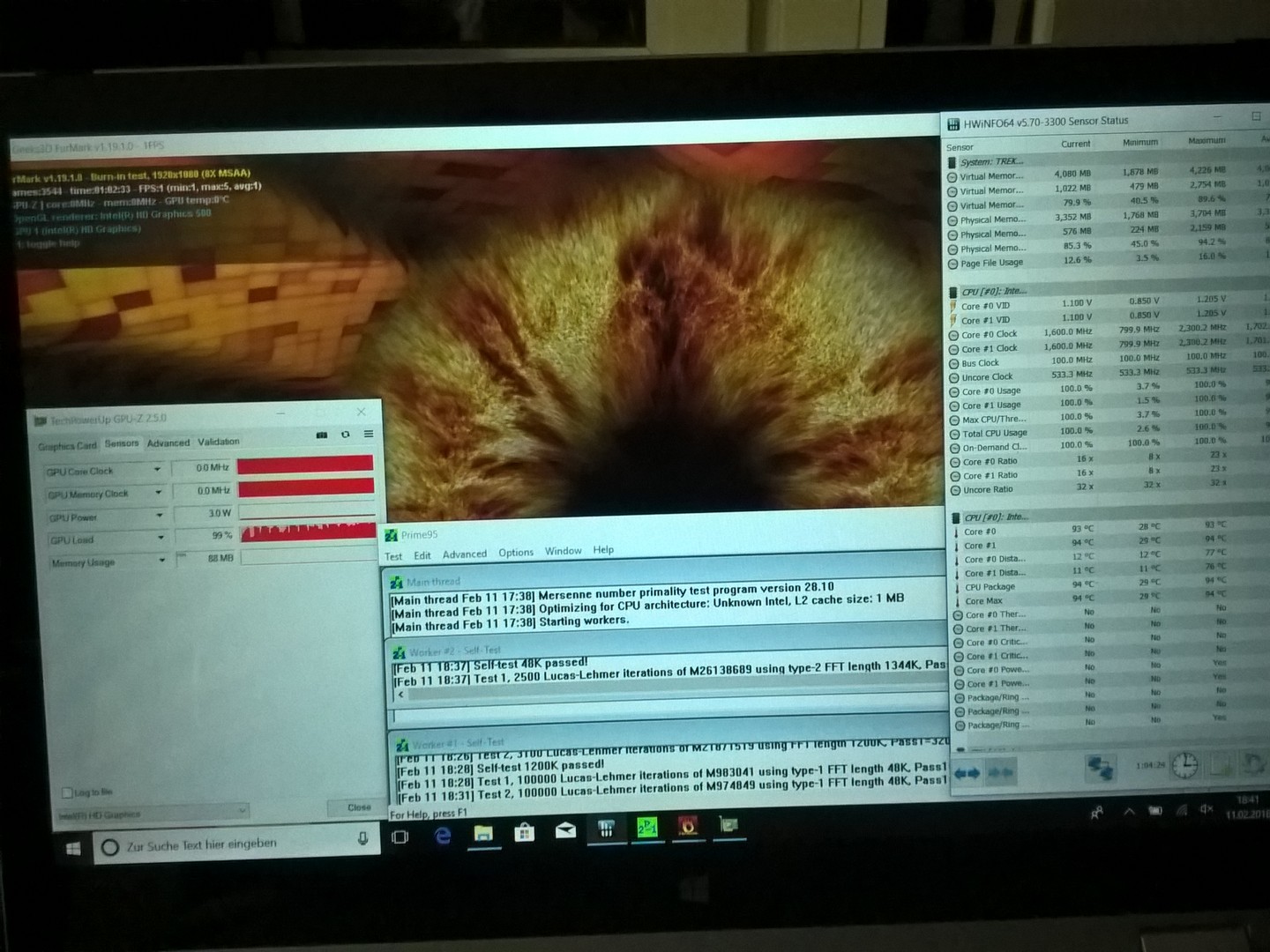 In unserem Stresstest-Szenario sieht das ähnlich aus, wobei wir am Ende des einstündigen Tests keine Tastatur- bzw. Mauseingaben mehr vornehmen konnten. Laut HWiNFO stand der CPU-Takt zu diesem Zeitpunkt bei 1,6 GHz und die Kerntemperaturen hatten die 90-Grad-Marke überschritten. Da diese extreme Belastung in der Praxis aber nicht vorkommen dürfte, ist nicht mit Ausfällen durch zu hohe Temperaturen zu rechnen.