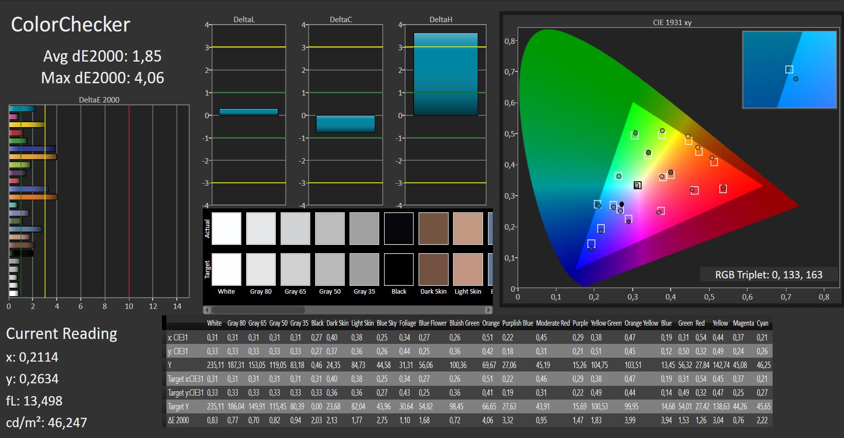| Colorchecker dE 2000 calibrated * | 1.85 | ||||