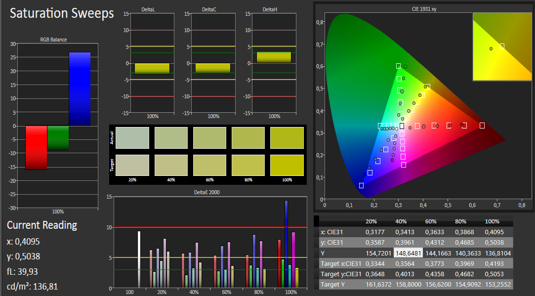 Die Farbdarstellung des Displays geht sehr in Ordnung. Im Auslieferungszustand liefert es eine durchschnittliche DeltaE-2000-Abweichung von 5,52. Damit liegen die Werte des Bildschirms nicht allzu weit vom Zielbereich (DeltaE kleiner 3) entfernt. Das Display zeigt einen sehr leichten Blaustich.